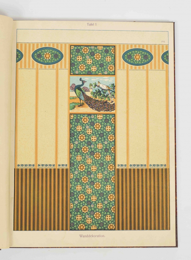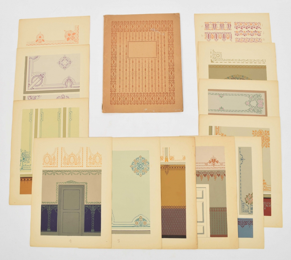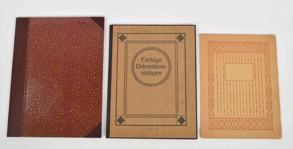 Karl Lüth, Kiel. Schablonenfabrik, Kunstgewerblicher Werkstatt, c. 1925. Rebound in half faux-leather, folio. 63 pp. with pricelist. Wallpaper in Art Deco style + Farbige Dekorations-vorlagen. Art Deco template catalogue. Rebound in cloth with orig. front board. No title p. With 32 plates, printed by Schiemann & Co, Zittau, c. 1920 - and another (Dutch?) with 15 loose leaves. Stamp inside Firma B. van Heuveln, Papierstrucfabriek "Holland", Groningen (c. 1920).