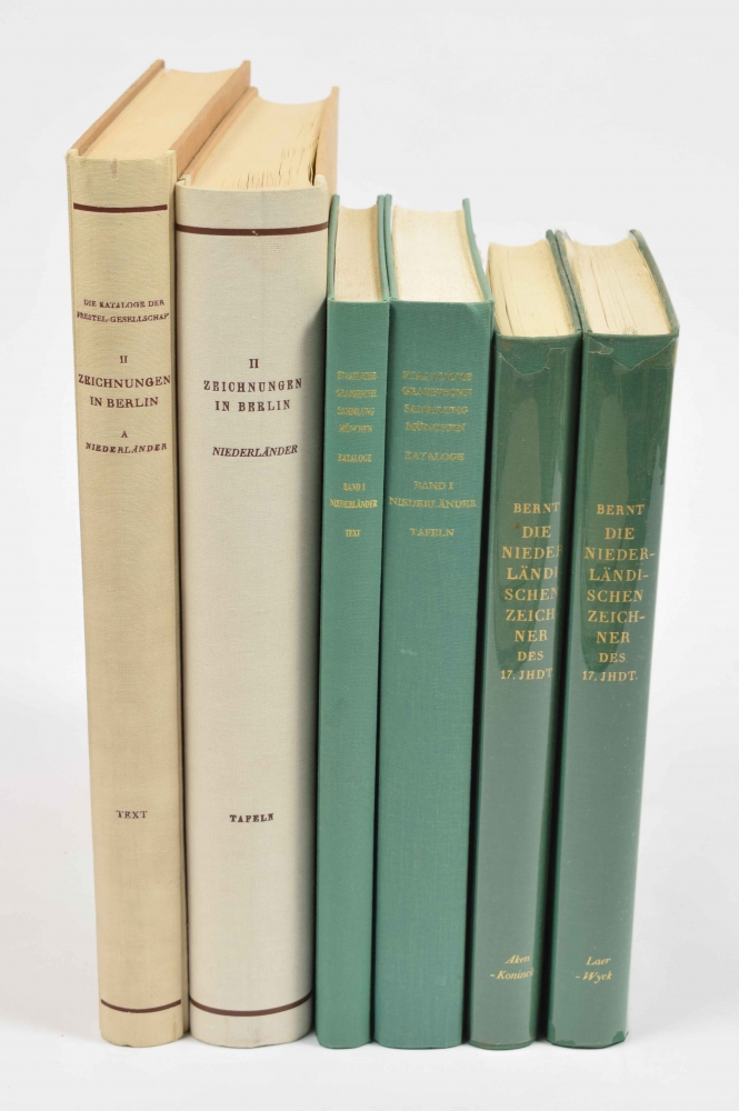 Die Kataloge der Prestel-Gesellschaft. II. Die Zeichnungen in den Staatlichen Museen zu Berlin. A. Niederländer. Text- und tafelband. Also issued under series title Die Zeichnungen alter Meister im Kupferstichkabinett, ed. M. J. Friedländer. The text vol. has been issued as a blockbook of the Bard edition, in a Prestel binding; (2) Die niederländischen Handzeichnungen des 15.-18. Jahrhunderts. Bearbeitet von Wolfgang Wegner. Berlin, Mann, 1973, text vol. with 244 p. and plate vol. with numerous illustrations on 456 plates, original uniform gilt-lettered cloth, 4to. And with 1 other work in German in 2 vols. by Walther Bernt. (total 3 in 6 vols.)