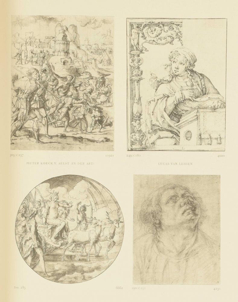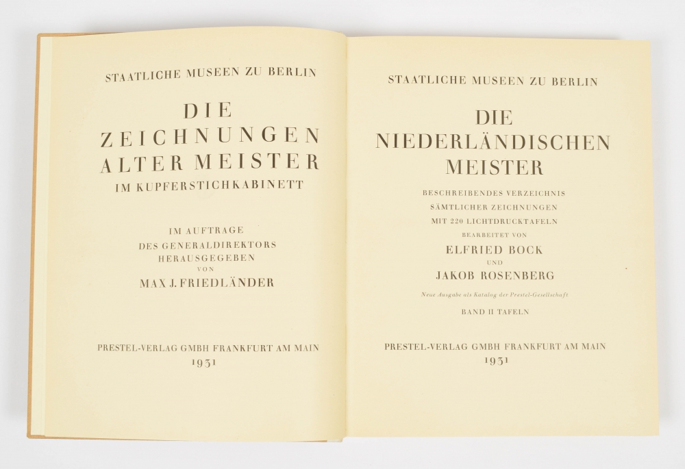Meister. Beschreibendes Verzeicnis sämtlicher Zeichnungen. Mit 220 Lichtdrucktafeln. Bearbeitet von Elfried Bock und Jacob Rosenberg. Berlin, J. Bard, 1930 (= Prestel, text vol.)/ Frankfurt am Main, Prestel, 1931 (neue Ausgabe as Katalog der Prestel-Gesellschaft, plate vol.), text vol. with 340 p. and plate vol. with 815 illustrations on 220 plates, original near-uniform halfcloth, folio.