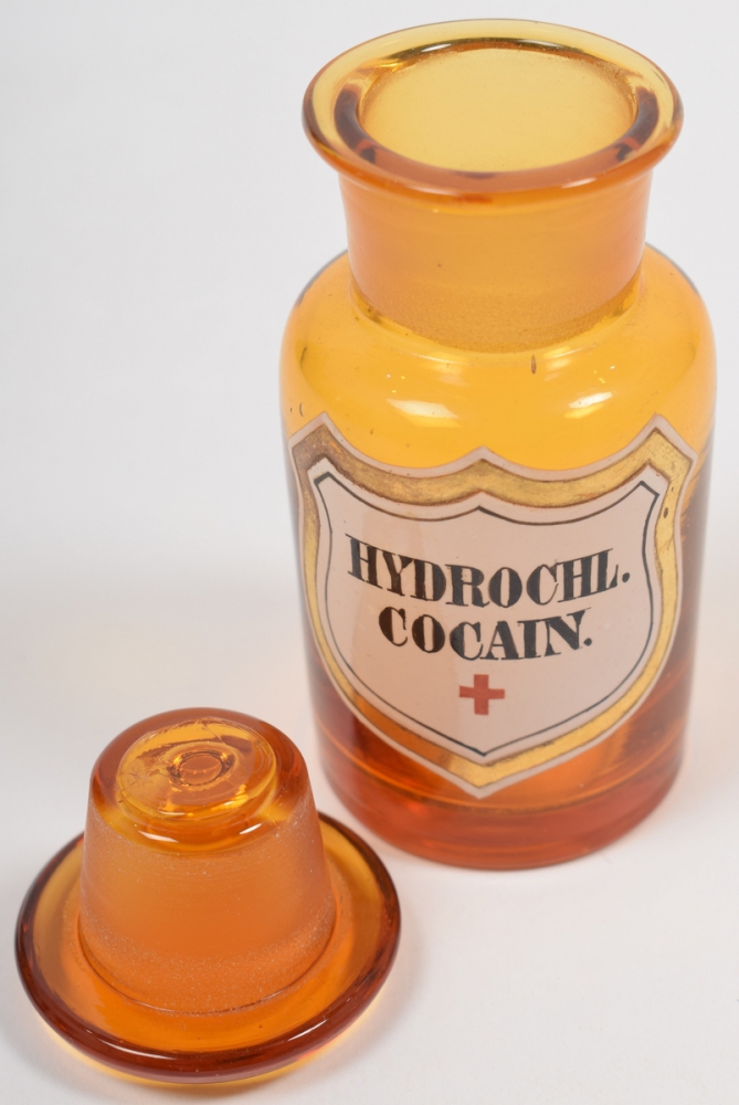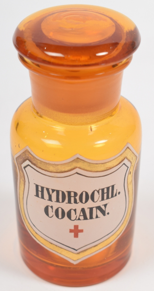 Brown glass pharmacist's bottle with stained-glass label with inscription Hydrochl Cocain and red cross for poisonous. 19th century.
