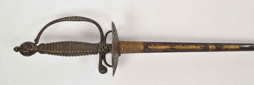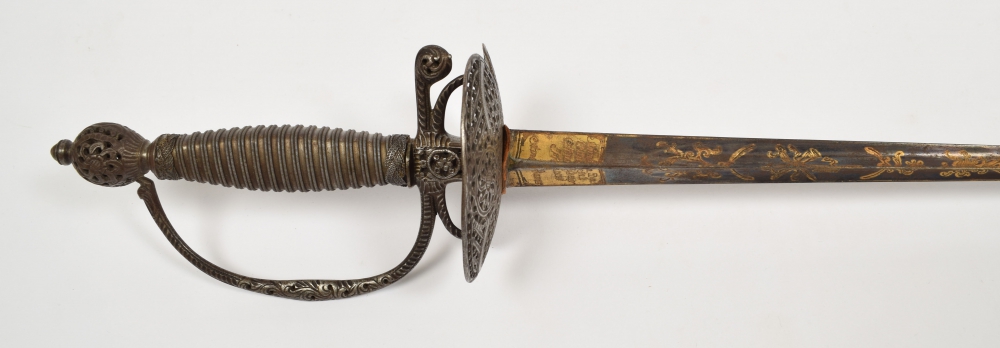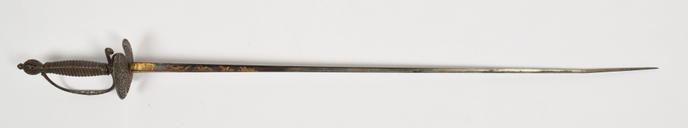 Three fullers with gilt finishing. Openworked knuckle-bow and openworked eggshaped pommel, fine decoration and leaf motifs, grip covered with braided and turned silver threads. Signed Abraham Du Celliee de heer Zwardveger in De Kalverstraat tot Amsterdam.