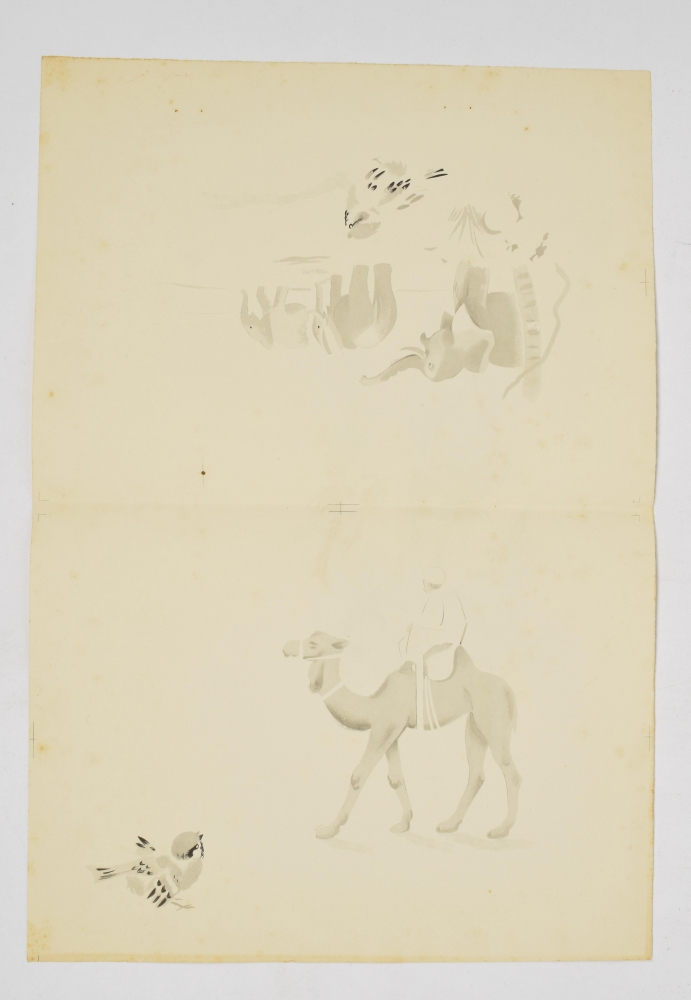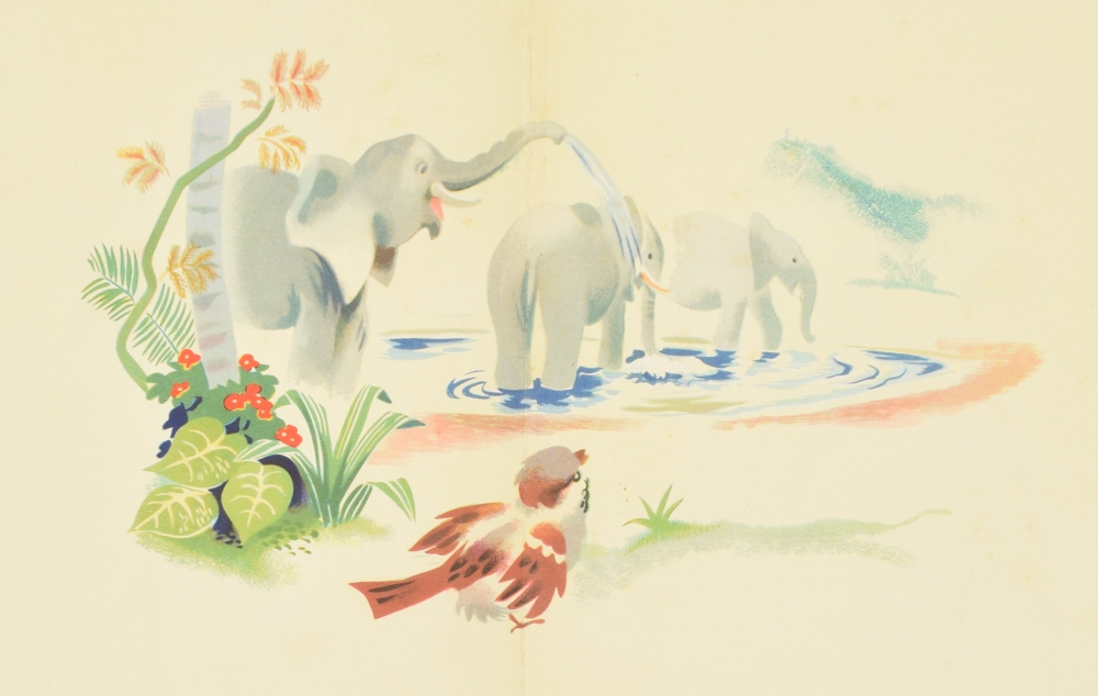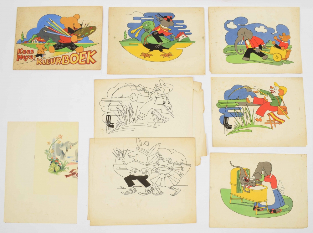 Colouring book with front board and 9 handcoloured and handdrawn plates, c. 1944 (?). Oblong, 24 x 31 cm. With the proof sheets for the print version.