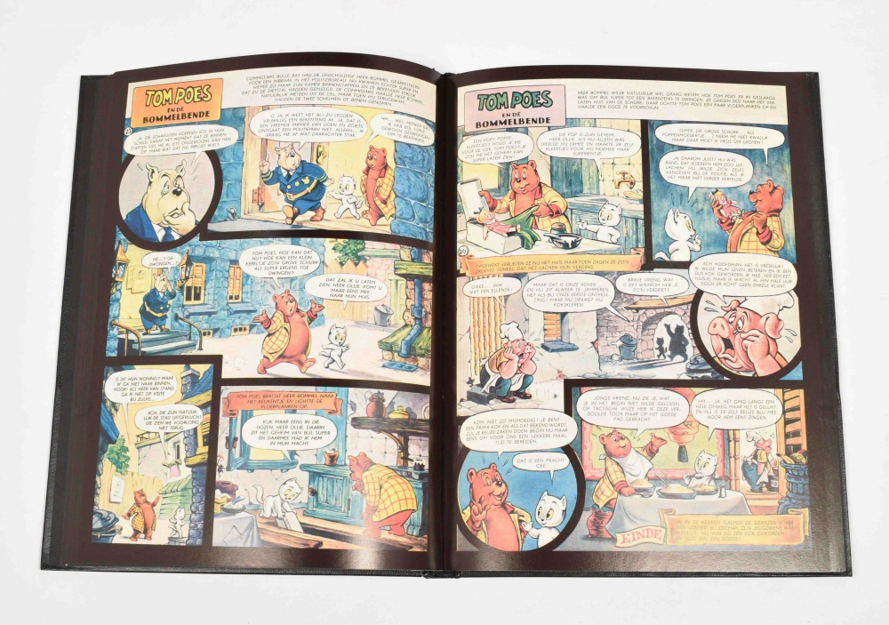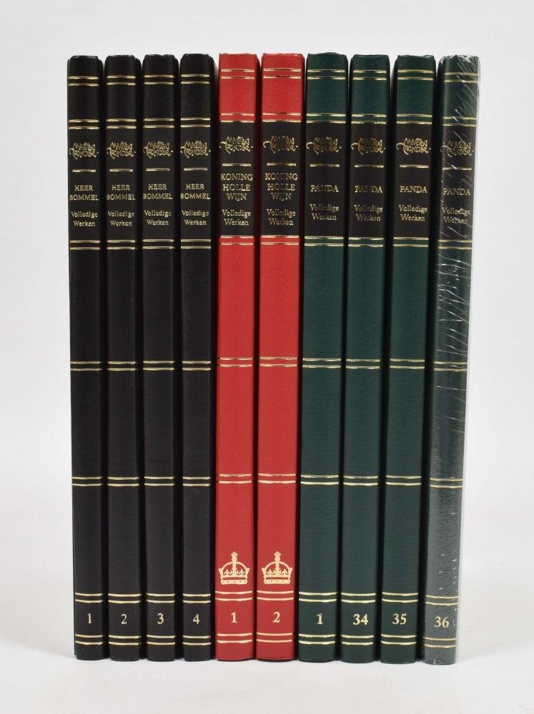 Heer Bommel Volledige Werken. Panda, The Hague, 1995. The complete collected stories published in Revue weekly. In 4 faux-leather binding with pasted plate + Panda Volledige Werken no. 1, 34, 35 and 36, 2012-2015 + Koning Hollewijn Volledige Werken vol. 1 and 2, 2012-2015. All in very good condition.
