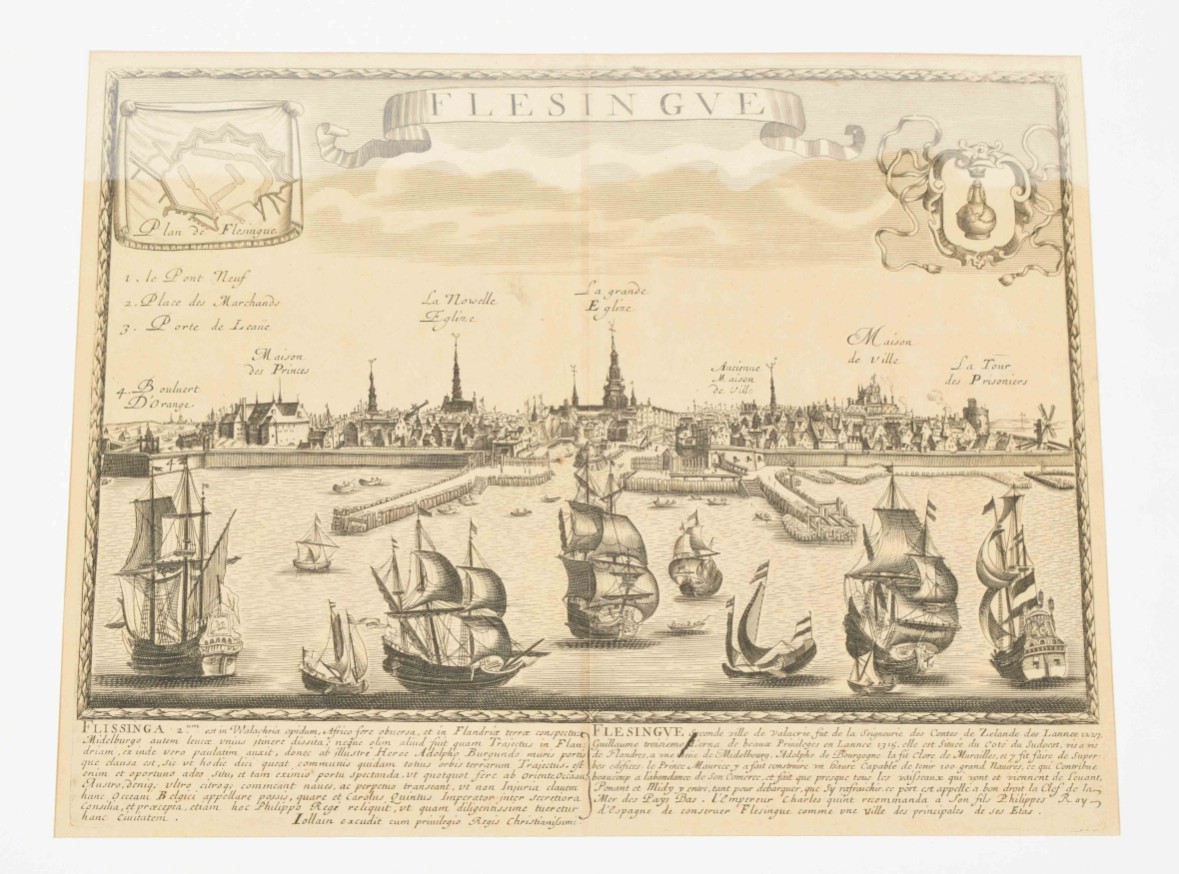 Central vertical fold as published; trifle yellowed. Fine copy of a splendid and extremely rare profile of Vlissingen, with indication of the main buildings, an inset plan and the city's coat of arms, and ships in the foreground. The French title below is: "Flesingue seconde ville de valacrie fut de la seigneurie des Contes de Zelande (...)".
