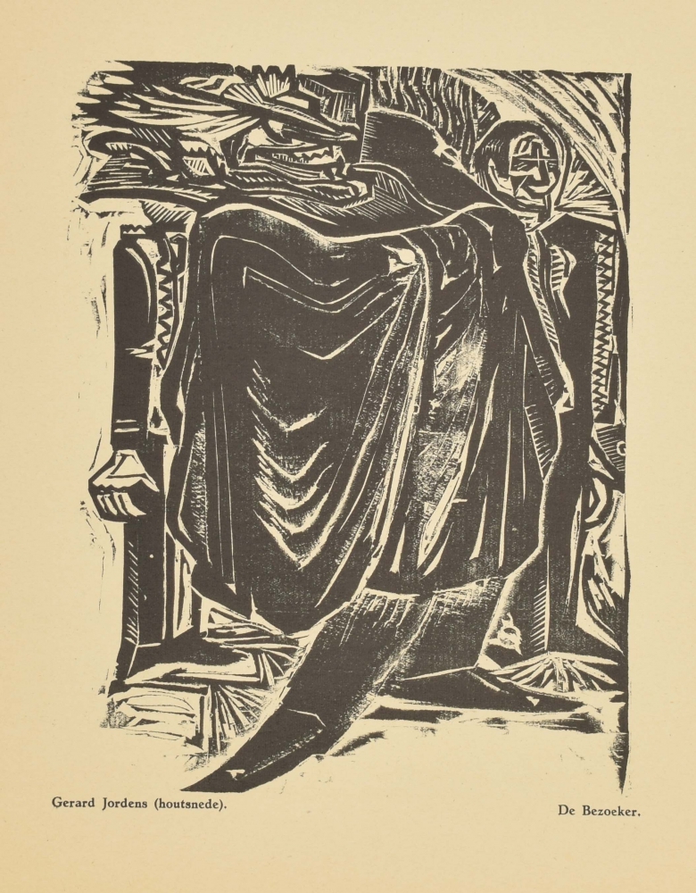 Maandblad onder redactie van Jan Wiegers en J.G. Jordens beeldende kunst, A. Defresne letterk. en tooneel, Daniel Ruyneman muziek. Groningen, H.N. Werkman, 1921, (18) p., with original woodcuts (incl. wrapper) by Valentijn Edgar v. Uytvanck (wrapper), Jan Wiegers (2x, "Liliom Fr. Molnar" and advertisement), Jan Jordens (2 vignettes) and Gerard Jordens ("De Bezoeker"), 1 pasted illustration and 2 other illustrations, original stapled green paper wrapper, 4to, 31 x 27.8 cm.