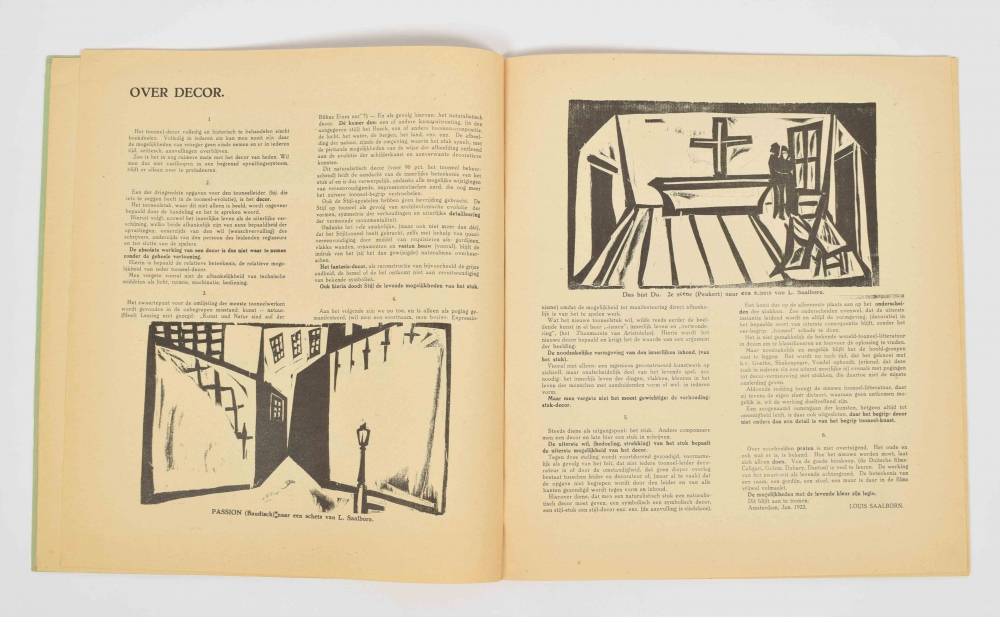 Contents and wrapper with (vague) folds to top right corner, front cover with mild creasing. Very good copy. Very rare. "Mededeelingen van de Redactie. Dit "Thema-nummer" is gewijd aan het Moderne Tooneel en verschijnt ter gelegenheid van de Intern. Theater-Tentoonstelling, te houden in de maand Januari 1922 in het Stedelijke Museum te Amsterdam".