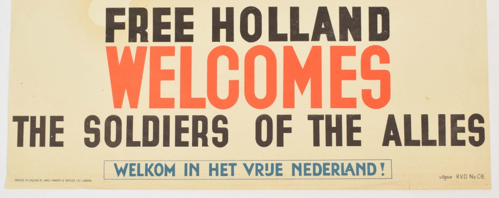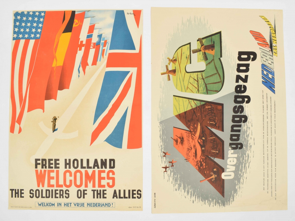 Free Holland welcomes the soldiers of the allies. Welkom in het vrije Nederland! Pat Keely, 1944. Printed in England by James Haworth & Brother LTD. London, issued by R.V.D. (Rijksvoorlichtingsdienst) no. C8. Lithography, 74 x 49 cm. Small tear to foot margin, else good + MG Overgangsgezag. Nederland zal herrijzen. Jan Le Witt, George Him, 1944. Lithography, 50.5 x 75.5 cm. Left margin sl. creased and torn, repaired with tape on reverse, else good.