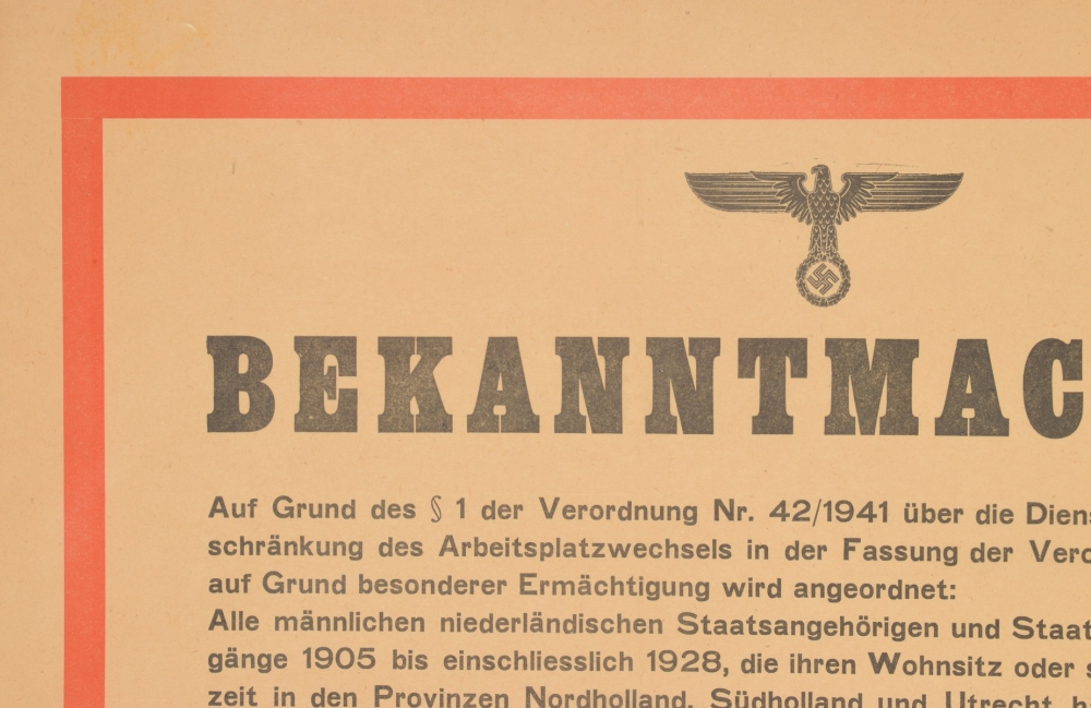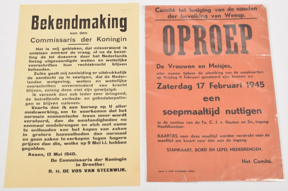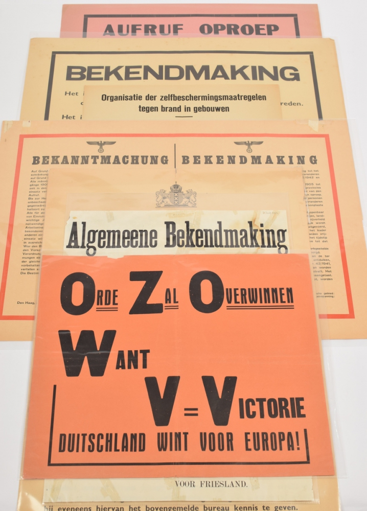 Aangifteplicht roerend bezit van Vijanden en Landverraders. Burgemeester De Boer. 19-06-1945, Stadsdrukkerij Amsterdam. 74,5 x 50 cm. Folded, a few tears to margin + Orde Zal Overwinnen Want V = Victorie, Duitschland wint voor Europa! + Schematische kaart van de Hiërarchische organisatie van de N.S.B. Utrecht, 1942 + 2 announcements by Rijkscommissaris Liese - and 6 more.