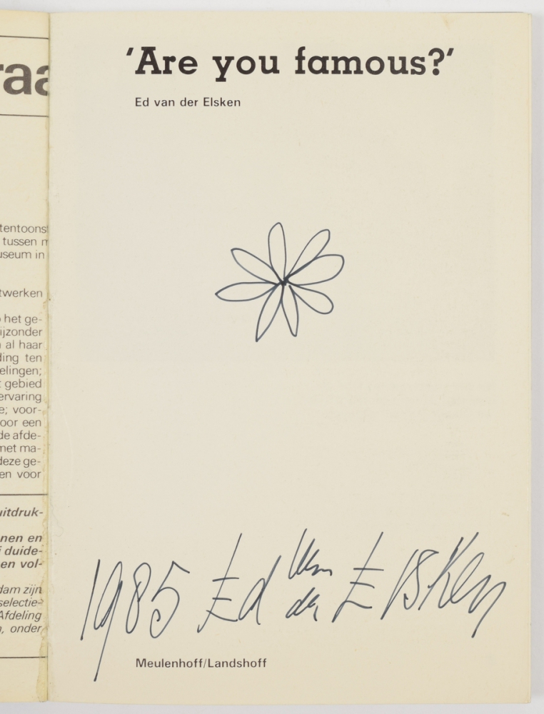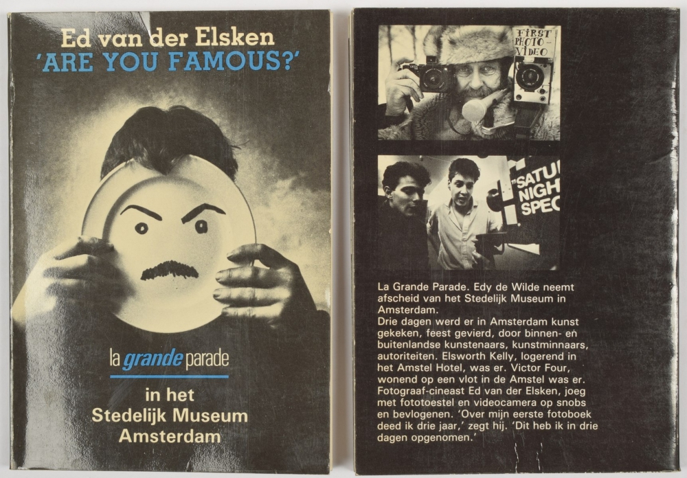 Signed "1985 Ed van der Elsken" and with drawing of a flower on title page. Text on the back cover: "La Grande Parade. Edy de Wilde neemt afscheid van het Stedelijk Museum in Amsterdam. Drie dagen werd er in Amsterdam kunst gekeken, feest gevierd (...). Fotograaf-cineast Ed van der Elsken, joeg met fototoestel en videocamera op snobs en bevlogenen. 'Over mijn eerste fotoboek deed ik drie jaar,' zegt hij. 'Dit heb ik in drie dagen opgenomen.'" With added a second, unsigned copy. (total 2)