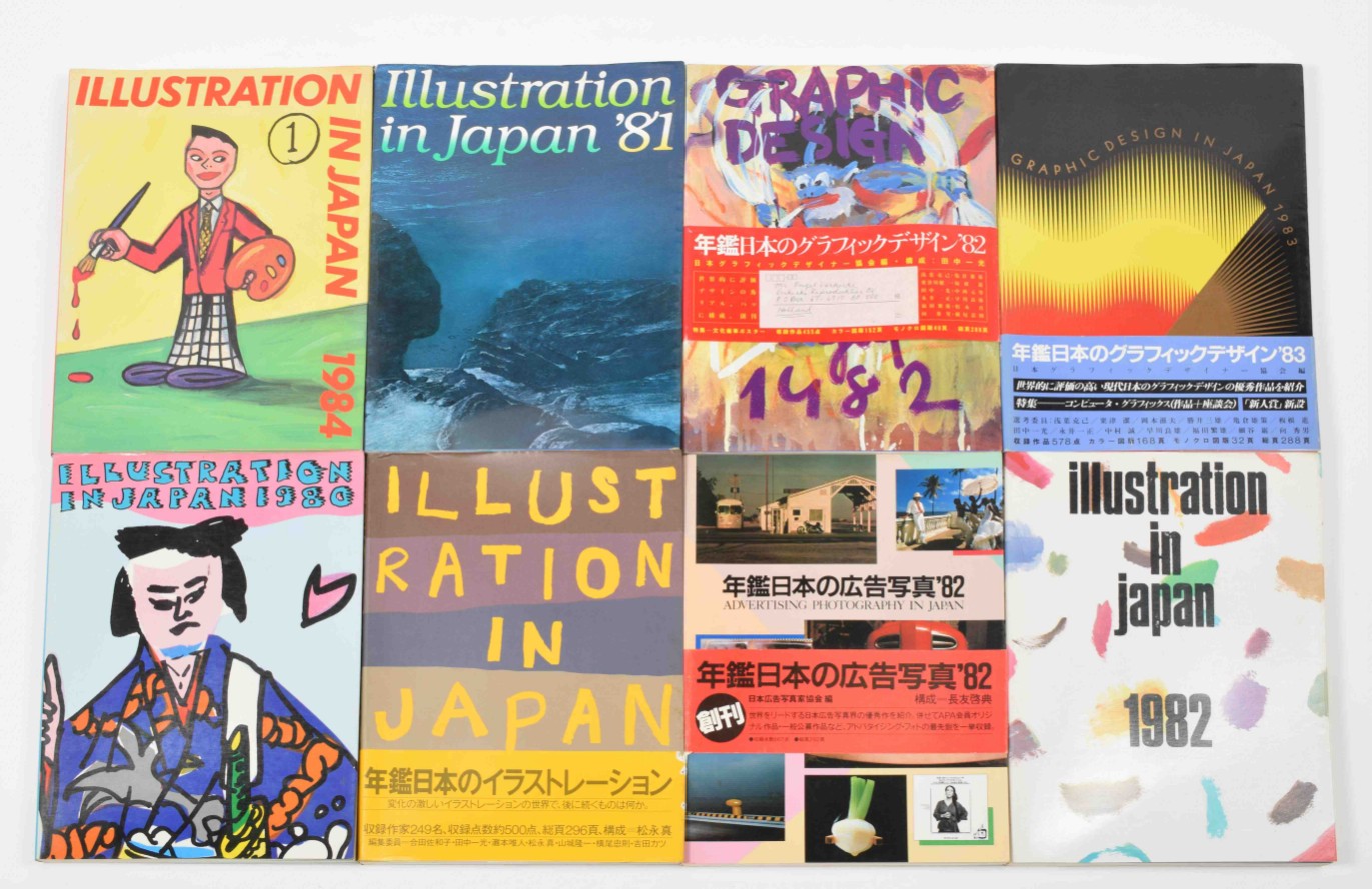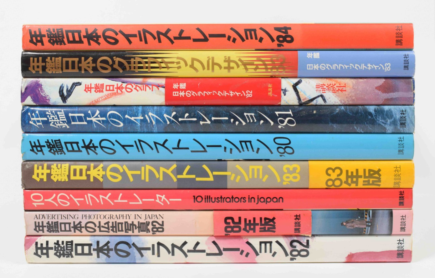 (Tokyo), Kodansha, 1980-1984. 5 vols. Ills. dustjackets, 1983 ed. with bellyband + Graphic design in Japan. N.pl., Japan Graphic Designers Associaton, 1982-1983. 2 vols. Ills. dust jackets with (dam.) bellyband. Added 2 other Japanese publications: Advertising Photography in Japan, 1982 + 10 Illustrators in Japan, 1980.