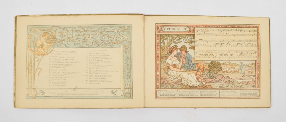 Ruth A. Hobson, The Daisy. Great-Grandmothers book. London, Blackie & Son Limited, c. 1900. Halfcloth with illustration on front board and gilt title on spine. Oblong, 65 pp. Binding with traces of use, else good + Walter Crane, Theo Marzials, Pan-pipes. A book of old songs. London, George Routledge and Sons, 1892. 2nd ed. Colour engravings by Edmund Evans. 4to, 52 pp. Traces of use + 2 more.