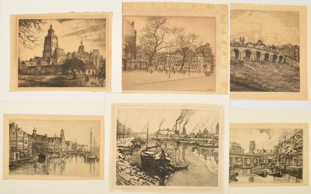 Added: (5) Zutphen, Jan Poortenaar, printed by Joh. Enschede en Zoon, and (6) Amsterdam, Hoordermarkt, F. Eversbag, printed by Roeloffzen, Amsterdam. (5) and (6) are later printings (1936 and 1938), signed in the plate and issued by the Vereeniging tot bevordering van beeldende kunsten 1936 and 1938. All with various sizes. (total 6)