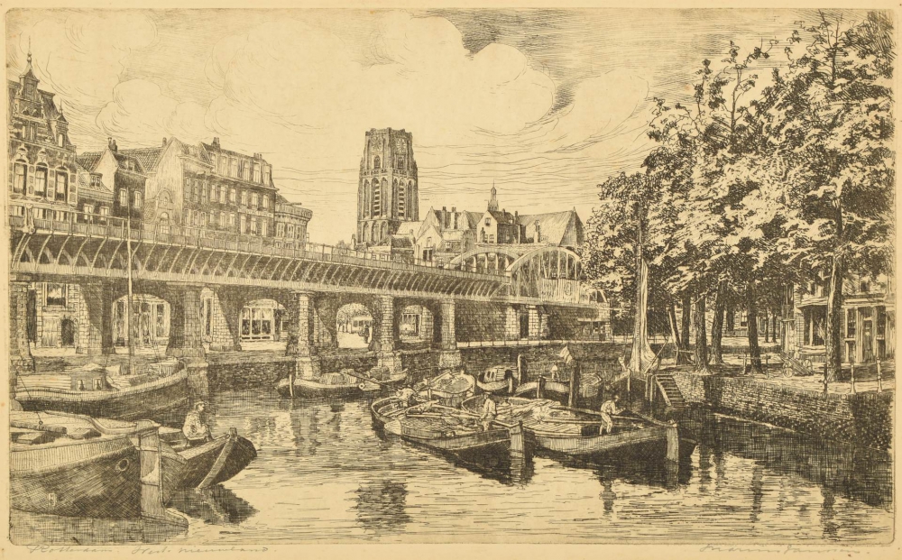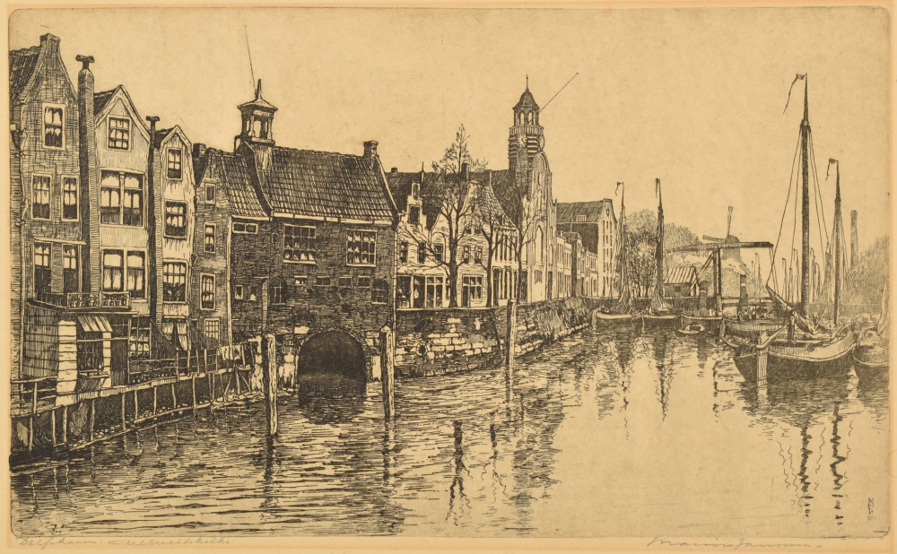(1) Delfshaven, Aelbrechtskolk, and (2) Rotterdam, West. Nieuwland by Marius Janssen. (3) Maastricht. Maasbrug by Johan Scherft. (4) Canal l'Hivers, Paul Leduc. All original impressions with signature from the early 20th century.
