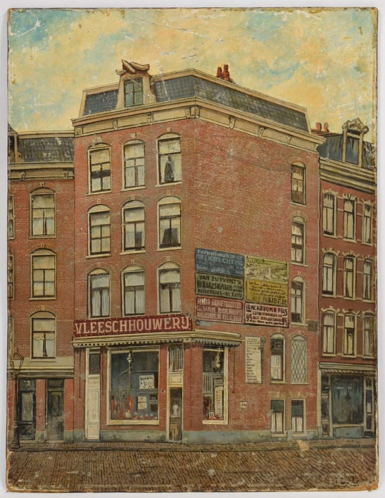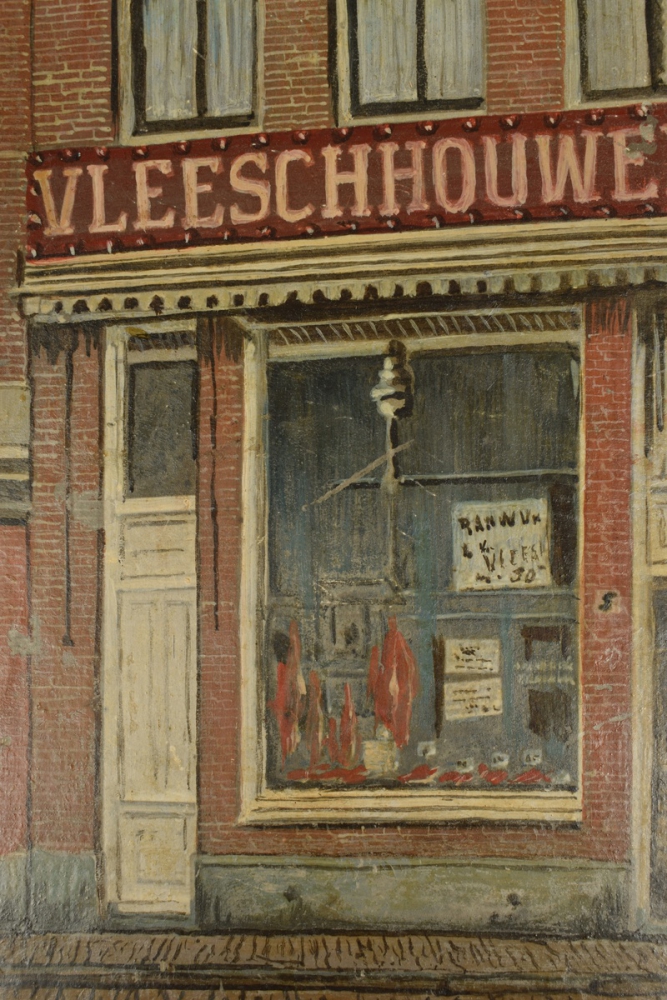 (Butcher's shop). Corner of Beukenplein/ Tweede Oosterparkstraat, Amsterdam. Oil on board, 66 x 51 cm. Naive painting, unknown artist, c. 1920.