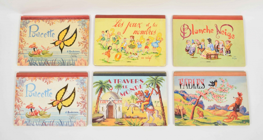 Pop-up books with fables, fairy tales and historical stories, mostly French. 18 books issued by Editions Lucos, most illustrated by Gildas, 1950s + Hank Hart, Mother Goose, Magic window. Animated Book Company Inc. New York, 1943 + Karl Simunek, Les mille et une nuits, Collection Surprise. G. Loewensohn, Fuerth, 1950 + 7 more.