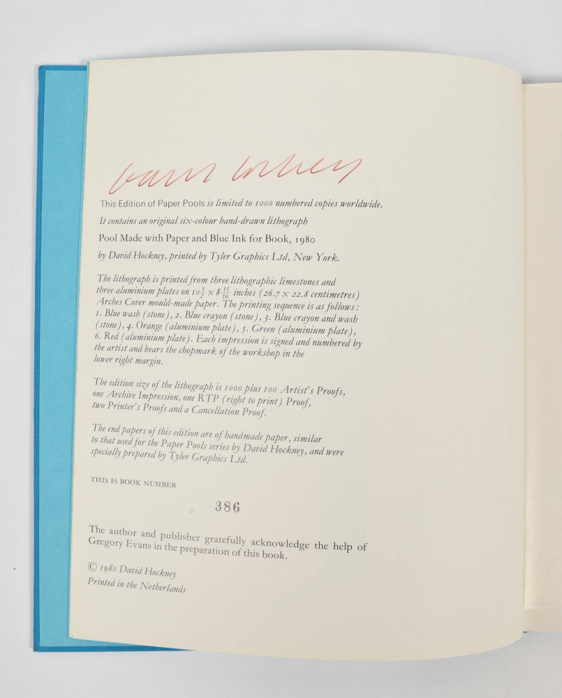 4to (27.5 x 23.5 cm.), blue cloth binding, ills. front board, endpapers of laid paper, title page with illustrations and printer's mark. Edited by Nicos Stangos. Numbered copy no. 386 of 1000 + 100 + 5 copies, signed in red at top of page (also numbered on accompanying cardboard sleeve). Thames and Hudson, London and New York, 1980.