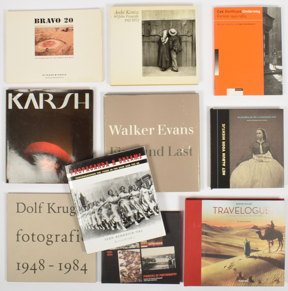 Norbert van den Berg & Steven Wachlin, Het album voor Mientje, een fotoalbum uit 1862 in Nederlandsch-Indië. Bussum, Thoth, 2005. 247 pp., halfcloth, 4to. Reproduction of one of the earliest family albums from Java + Cas Oorthuys, Onderweg. Met een inleiding van Cees Noteboom. Amsterdam/ Antwerp, Contact, 2001. 191 pp. Orig. wrapper, 4to + André Kertész. 60 Jahre Fotografie 1912-1972. Düsseldorf, Hanns Reich, 1972. 224 pp. Cloth with dust jacket, oblong 4to. Dust jacket and title page with some staining, top edge dust jacket curling, else good - and another 8 photobooks.