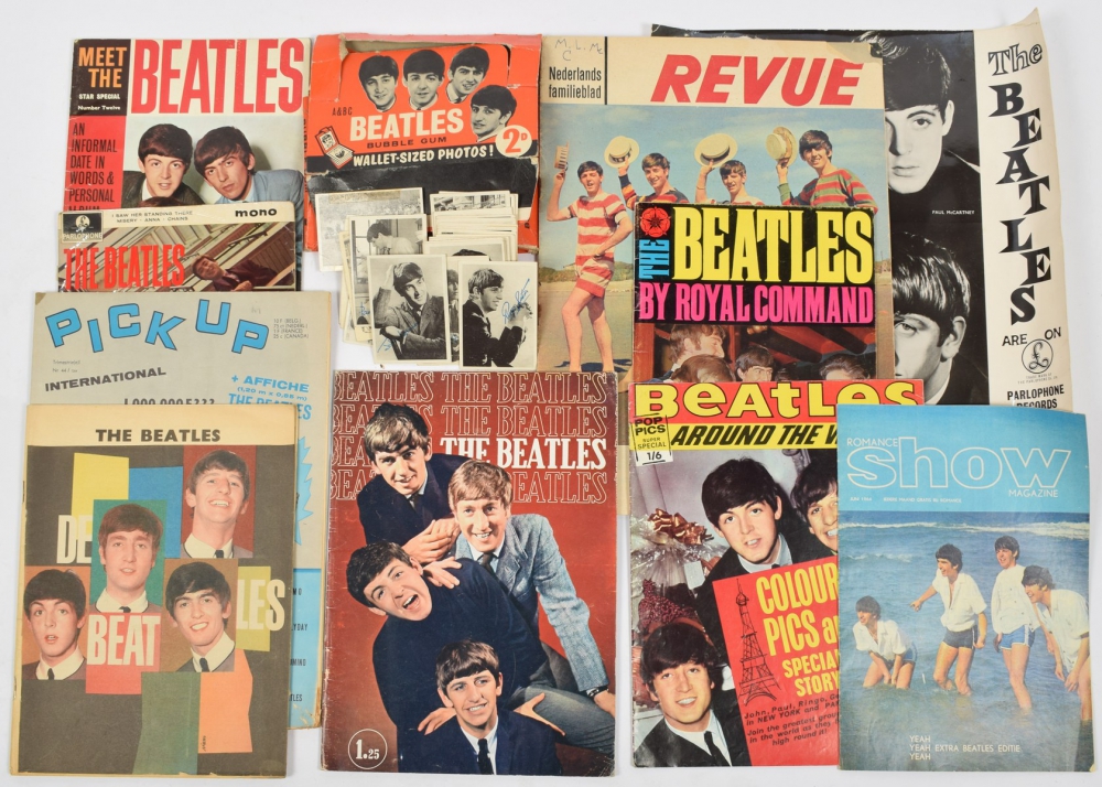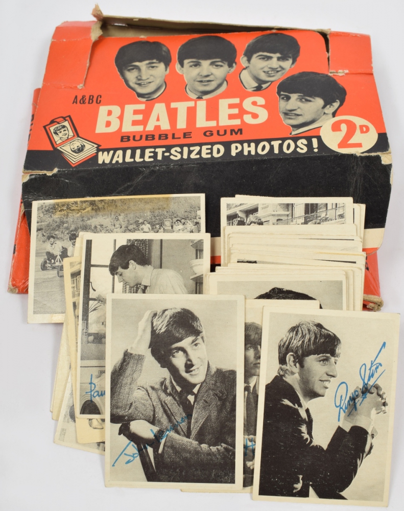 A&BC Beatles Bubble Gum Wallet-sized photos! Box (dam.). with 35 (of 60 issued) photocards + Romance show magazine. Yeah Yeah Yeah Extra Beatles editie. June 1964 + Revue no. 14, 1964 with Beatles cover + promotional photo Parlophone Records + Pick Up International. Bilingual poster magazine, 44, 1964. With poster of The Beatles (120 x 85 cm.) + another 4 Beatles publications - and maxi single 'I saw her standing there/ Misery/ Anna/ Chains', Parlophone Mono.