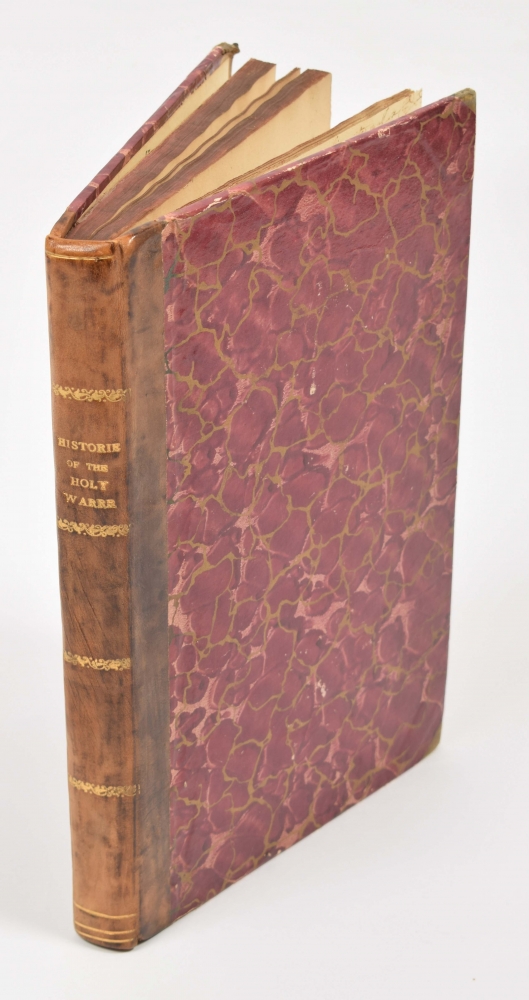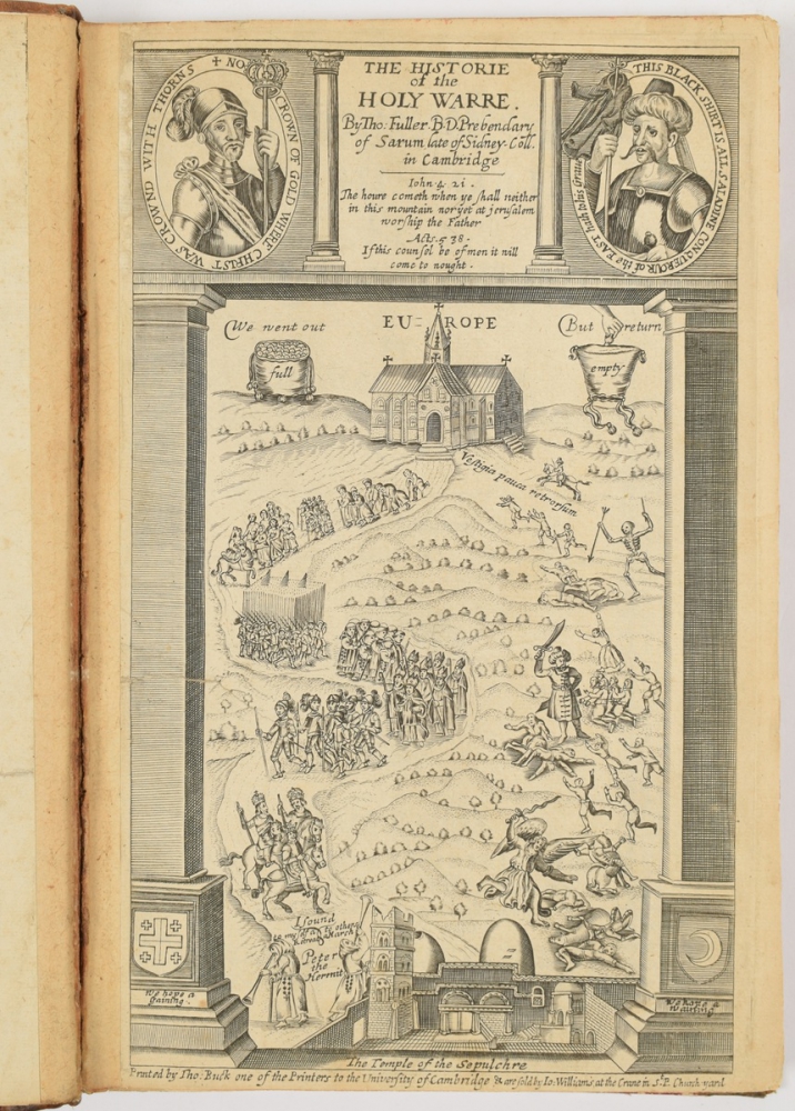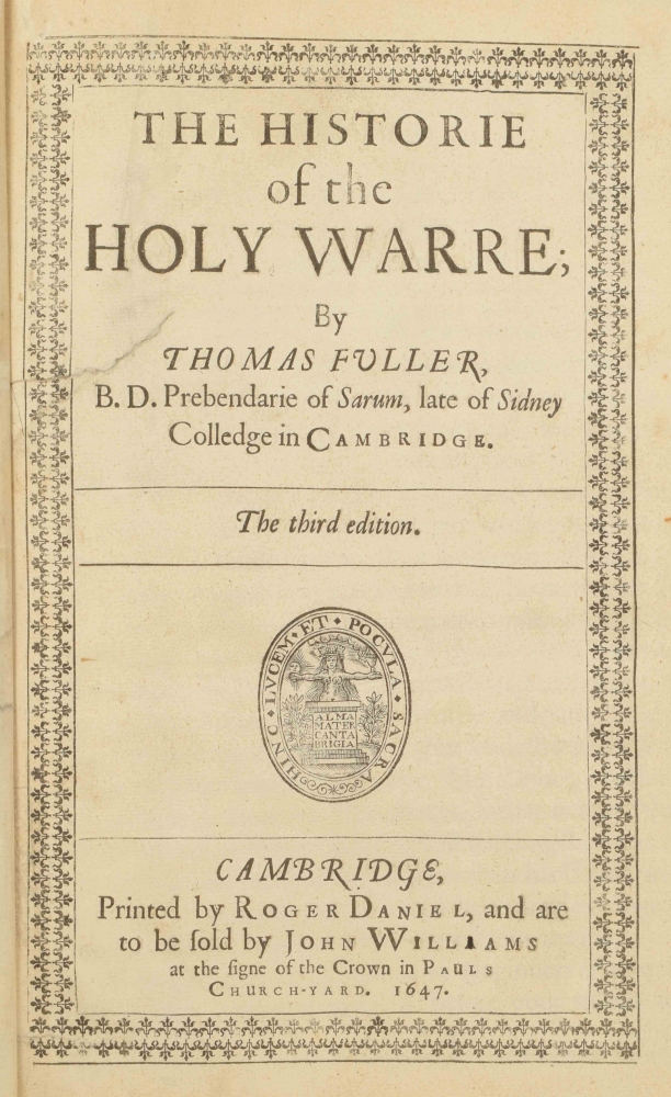 Thomas Fuller, B.D. Prebendarie of Sarum, late of Sidney Colledge in Cambridge. Third edition. Cambridge, Roger Daniel, 1647. Large 8vo, halfleather, marbled boards, title on spine in gilt stamping, ills. frontispiece with image of the voyage to Jerusalem and back facing the explanation of the frontispiece, title with vignette, (14),286,(28) pp., a folding map of Palestina with legend and critical annotation.