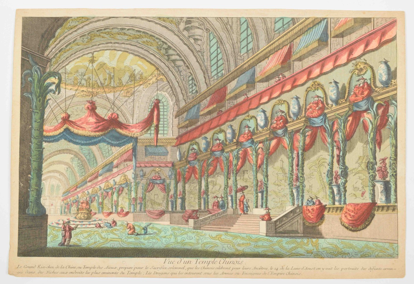 Contemp. handcol. and gommé engr. optical print, 29.5 x 43.5 cm, without address, (c. 1770), with descriptive text in French below the image (narrow margins).