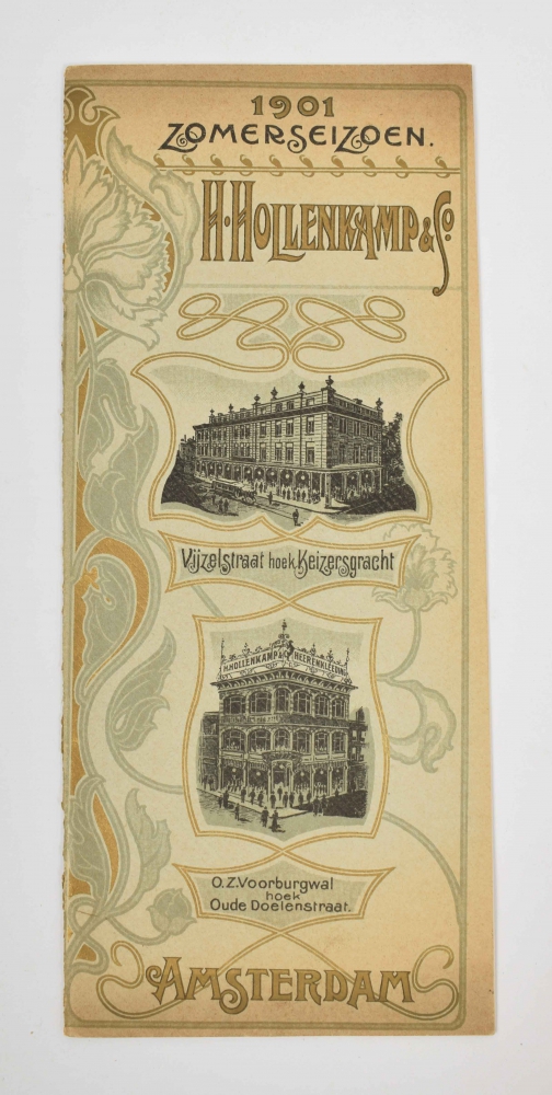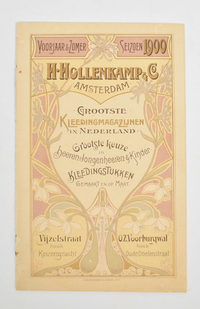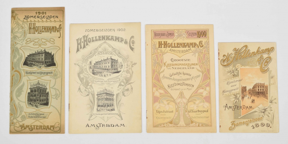 4 Zomerseizoen catalogues, 1899 to 1902, for this clothing warehouse with stores on Vijzelstraat and on Oudezijds Voorburgwal. Finely designed catalogues with art deco decorations and lithographed images. All in good condition.