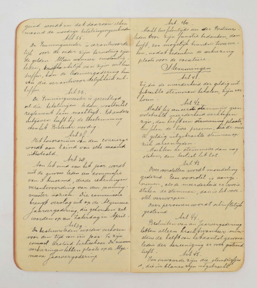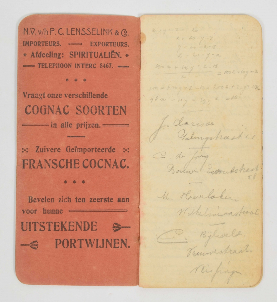 Manuscript rules for Literaire Vereeniging Tonido, Amsterdam. 11 p., Amsterdam, 1910. Signed by chairman R. van der Klip and secretary C.C. J.G. Cool. Founded by students of the Rijks hogere burgerschool in Amsterdam in order to 'liefde aan te kweeken voor de Nederlandsche Taal en Letterkunde'. Followed by 14 pages of manuscript poetry by one of its members. 8vo, stapled in notebook with advertising for Oorlam, Oude Genever. P.C. Lensselink & Co, Amsterdam.