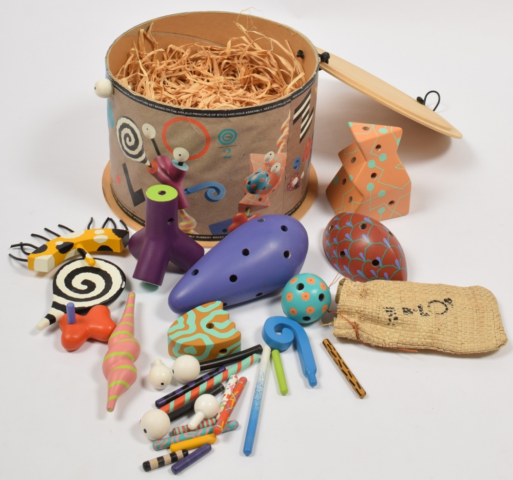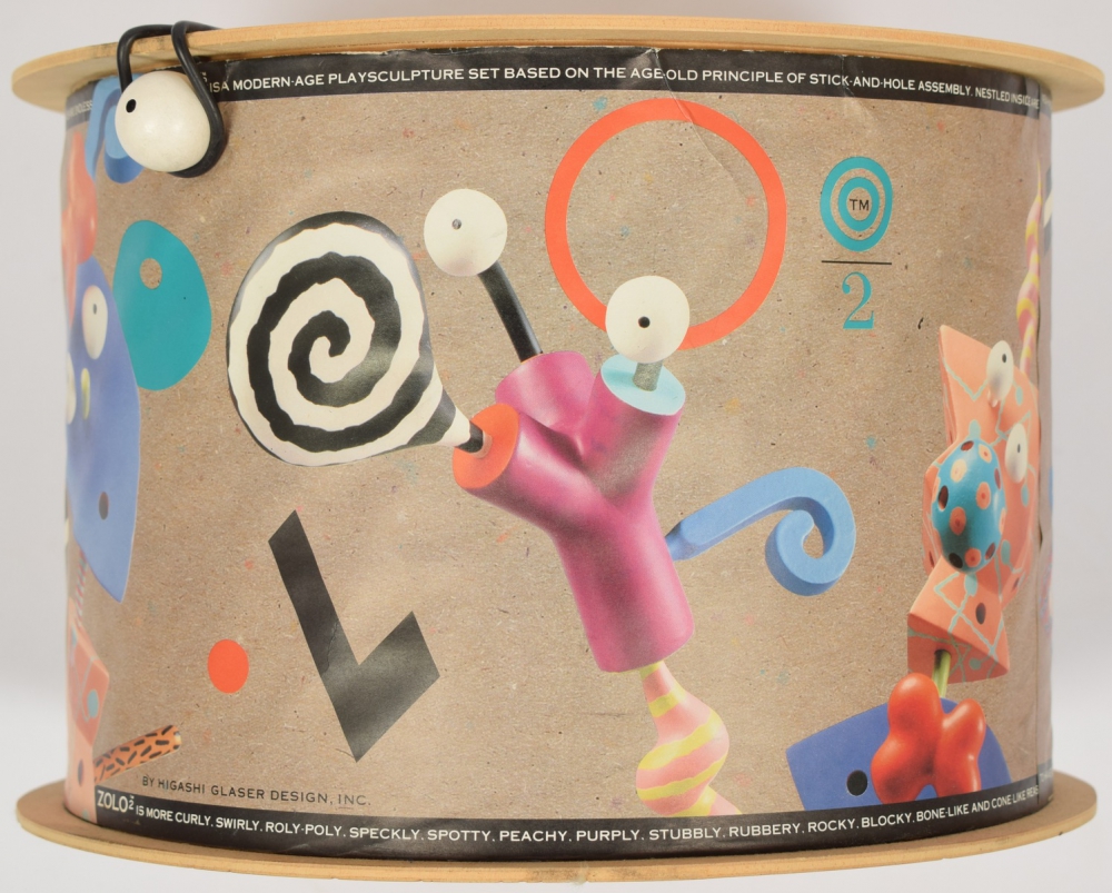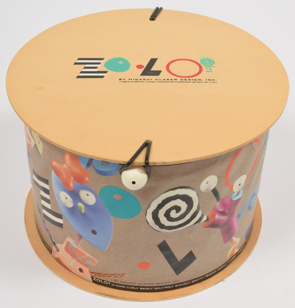 Higashi Glaser design, handcrafted in Indonesia for Zolo, U.S.A., 1989. Game with 30 insertable handpainted wooden figures. Original in box. 19 x 26 cm.