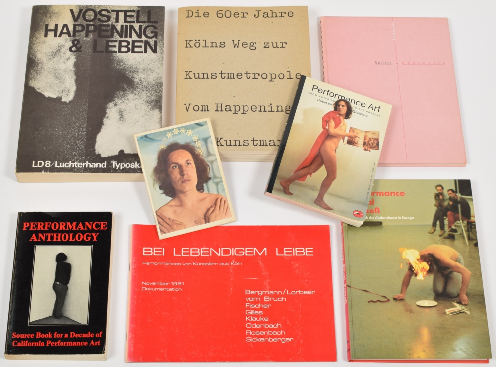 With Vostell's famous aphorism in facsimile on the flyleaf: "Ereignisse sind Waffen zur Politisierung der Kunst"; (2) Die 60er Jahre. Kölns Weg zur Kunstmetropole. Vom Happening zu Kunstmarkt. Ed. W. Herzogenrath & G. Lueg. Cologne, Kölnischer Kunstverein, 1986, 580,(34) p., many illustrations, original wrapper, 4to; (3) Elisabeth Jappe. Performance. Ritual. Prozess. Handbuch der Aktionskunst in Europa. Munich, Prestel, 1993, 219 p., many illustrations, original cardboard, 4to; (4) Luigi Ontani. Turin, Galleria LP 220/ F. Paludetto, n.d., printed in 2000 copies, 43,(2) p., 17 photographic illustrations, original stapled wrapper. And with 4 more on performance art. (total 8)