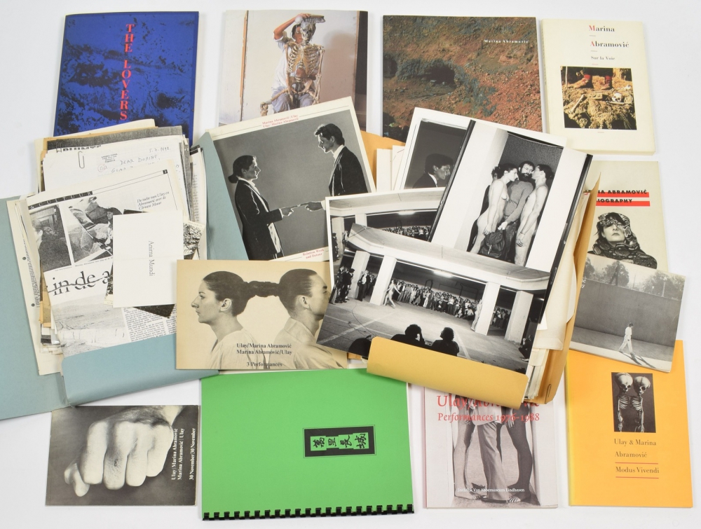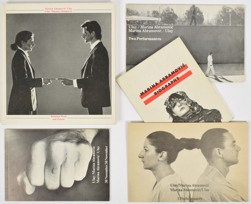 (2) Same. 30 November/ 30 November. Wiesbaden-Erbenheim, Harlekin Art, 1979, printed in 1000 copies, (48) p., many photos, original wrapper, oblong 8vo. With owner's name Dorine Mignot (upside down) to inside front cover; (3) Same. Relation/ works. 3 Performances. Innsbruck/ Graz, U. Krinzinger/ H.G. Haberl, 1978, printed in 1200 copies, (48) p., original wrapper, oblong 8vo; (4) Proposal book. The Great Wall Walk. A project by Ulay and Marina Abramovic. Introduced by the Aphis Foundation, Amsterdam. Original proposal book, stencilled, (3),27 leaves printed on one side, 15 leaves with supplements (copy of notarial deed of foundation Amphis and museum letters of recommendation), 2 satellite photos, original spiralbound wrapper, A4-size. With added a typed letter by Tijmen van Grootheest (Amphis chairman) to Dorine Mignot (board member) and a copy of a written dismissal from the Chinese embassy at The Hague. And with 10 more on the same, incl. one with dedication (difficult to read) and two very interesting files with many original photos and copied documentation from the possession of Dorine Mignot (1x on the Chinese Wall project). (total 14)