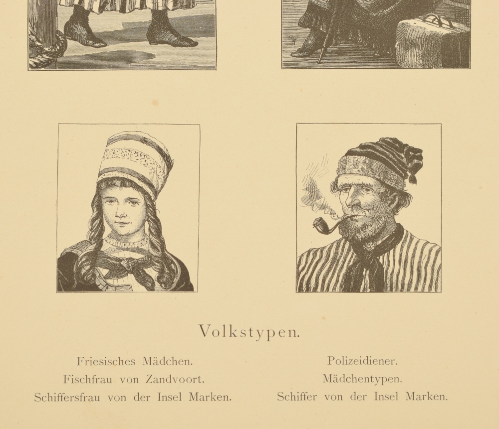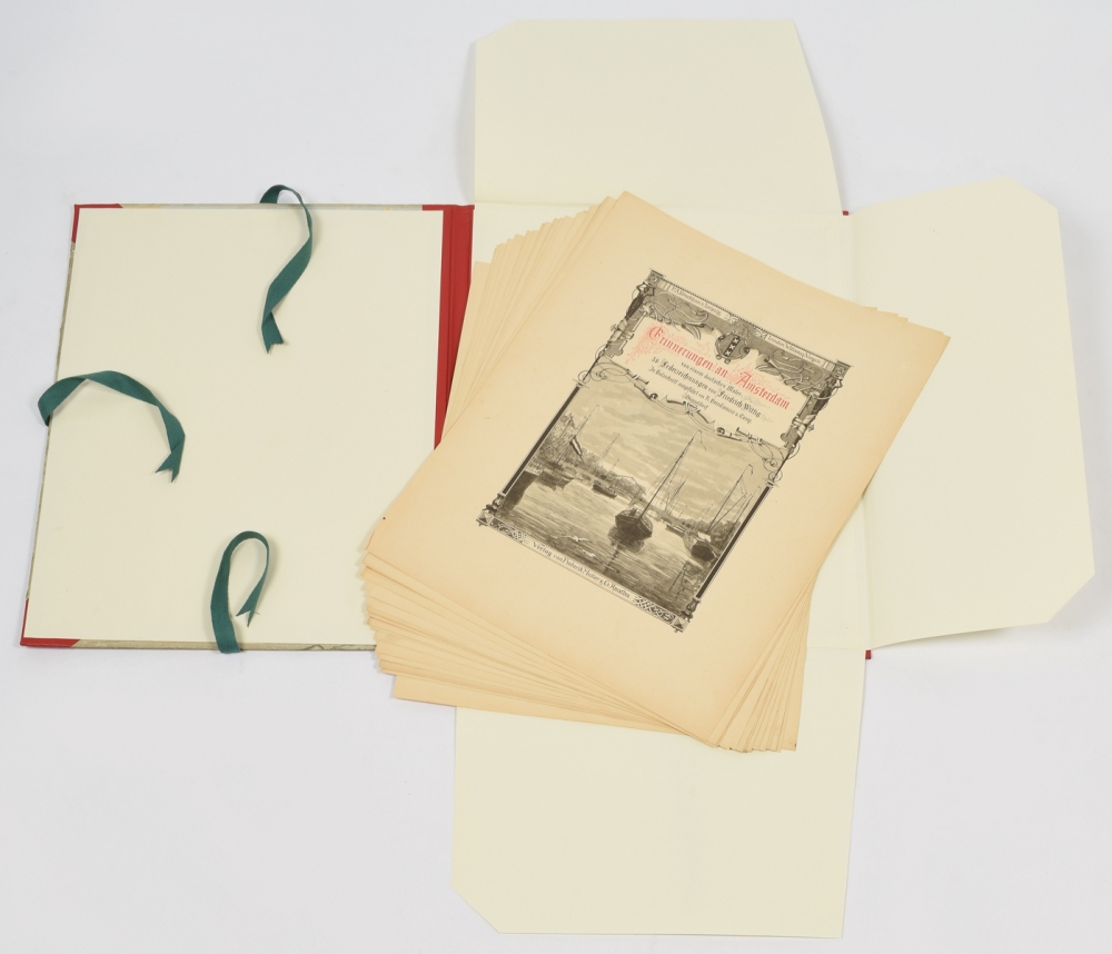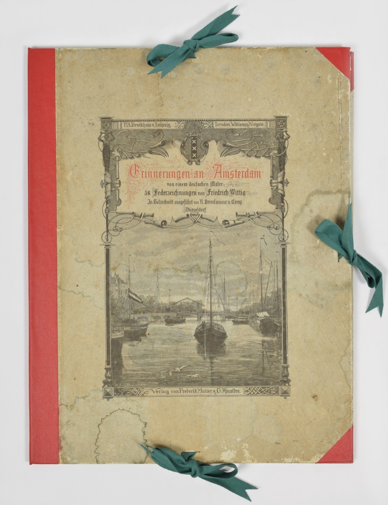 von einem deutschen Maler. 58 Federzeichnungen von Friedrich Wittig. In holzschitt ausgeführt von R. Brend'amour u. Comp., Düsseldorf. Verlag von Frederik Muller & Co, Amsterdam, [1880]. Incl. Am Bahnhof, Aus dem Zoologischen Garten, Aus dem Judenviertel and Skizzen aus Heineken's Brauerei. Folio (40 x 30.5 cm.). File restored. In new halfcloth with orig. (sl. stained) boards. Ribbon-bound.