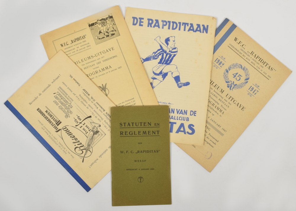 Statuten en reglement der W.F.C. "Rapiditas" Weesp, opgericht 4 januari 1902. Stapled, 24 p. + W.F.C. "Rapiditas" Jubileums-uitgave ter herinnering aan het 25 jarig bestaan der vereeniging tevens programma der feestelijkheden te houden op 8 januari 1927. Stapled, 24 p. + De Rapiditaan. Officieel orgaan van de Weesper Footballclub Rapiditas, Dec. no. 1951. 7 p. + W.F.C. Rapiditas Jubileum uitgave 1902-1932. Stapled, 24 p. - and Jubileum uitgave 1902-1947. Stapled, 20 p.