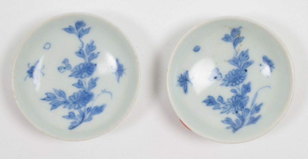with loose insert and lid. Signature on bottom. Diameter 7.5 cm + 2 small bowls. Signature on bottom. Diameter 5.5 cm. All with ticket on bottom "Hatcher Collection, Christies june '84". Added: 2 miniature 18th-century blue and white porcelain vases. Height 7 cm.