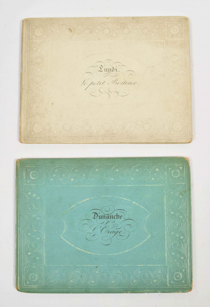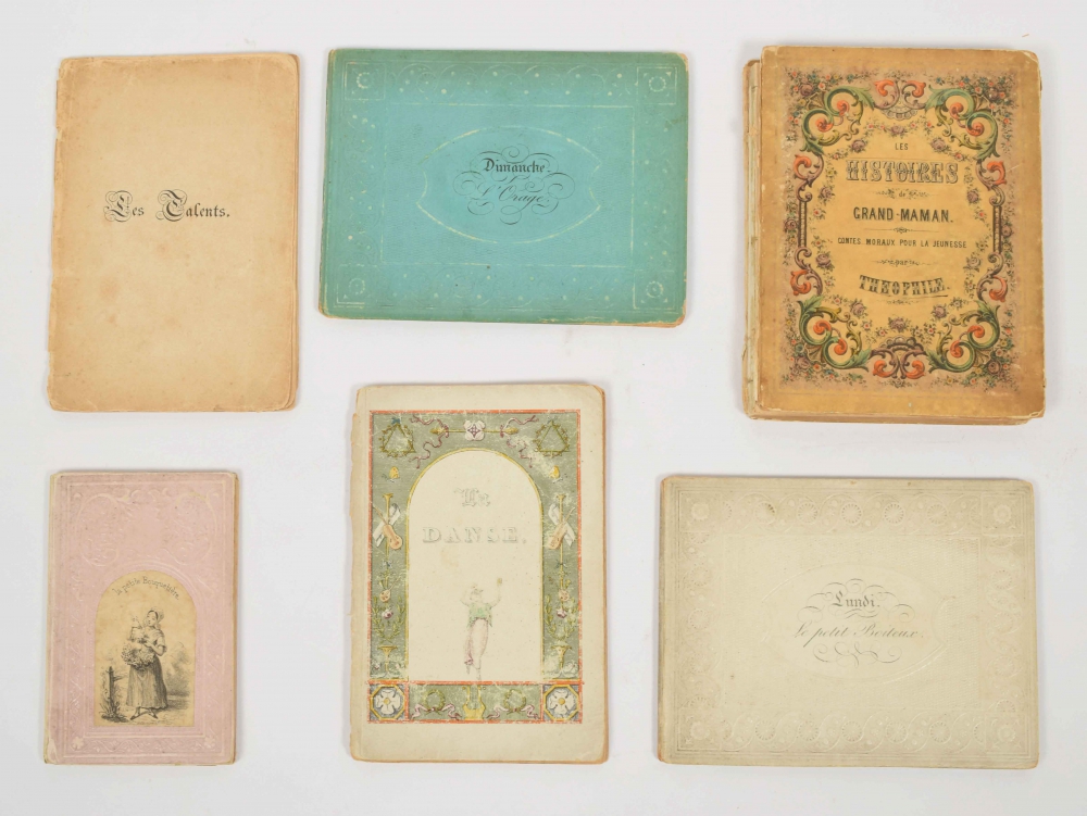 Author unknown. Paris, Marcilly, c. 1825. Small oblong, vii, 24 p. + Dimanche. L'Orage. p. 123-150 (= complete) [the same] + La Danse. Serie Les Talents, M. Brès. Paris, Lefuel, c. 1830 + from the same series: l'Écriture (lacks wrapper) - and another 2 dam. French children's books.