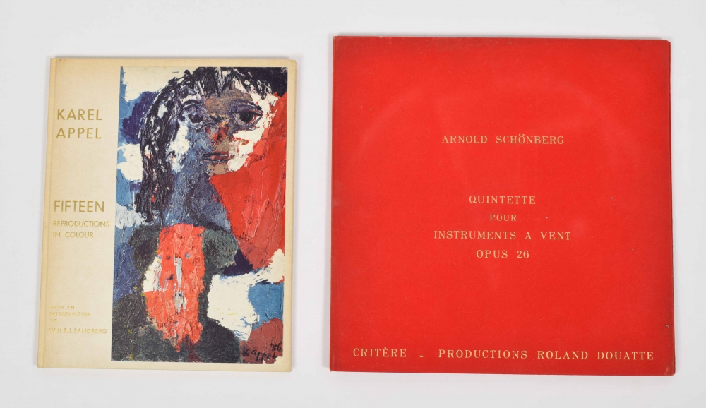 Karel Appel fifteen reproductions in colour. With an introduction of W.H.B.J. Sandberg, Strengholt, 1971. Signed by Hugo Claus and Karel Appel + Arnold Schönberg. Quintette pour instruments a vent. Opus 26, Critère, Roland Douatte, c. 1965. Numbered copy incl. booklet with cover lithograph Pierre Alechinsky.