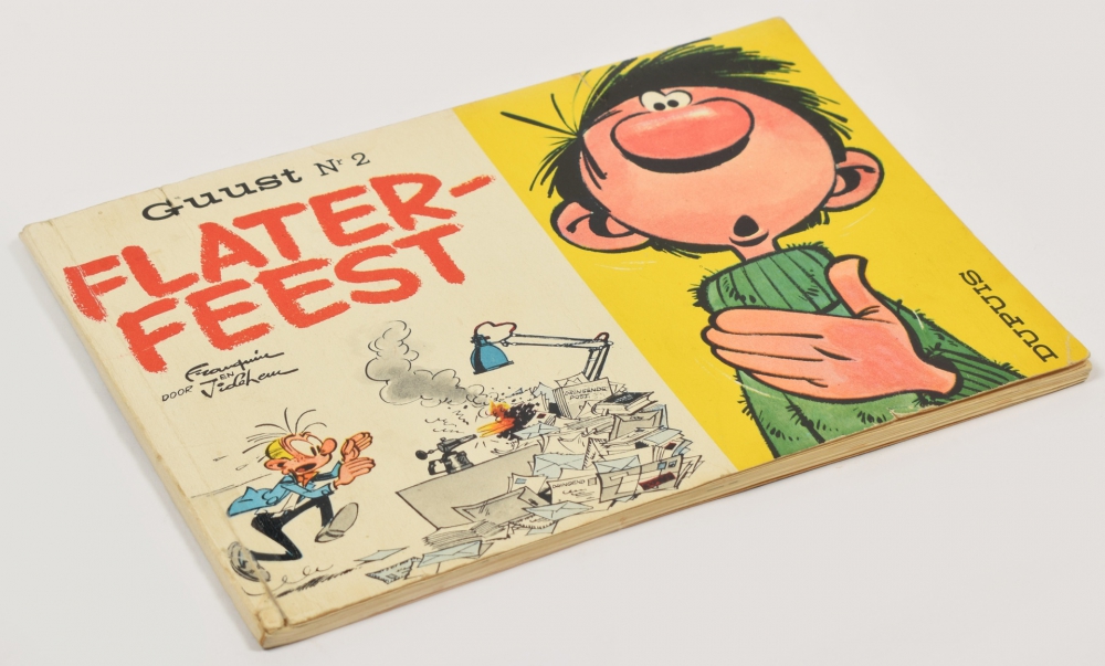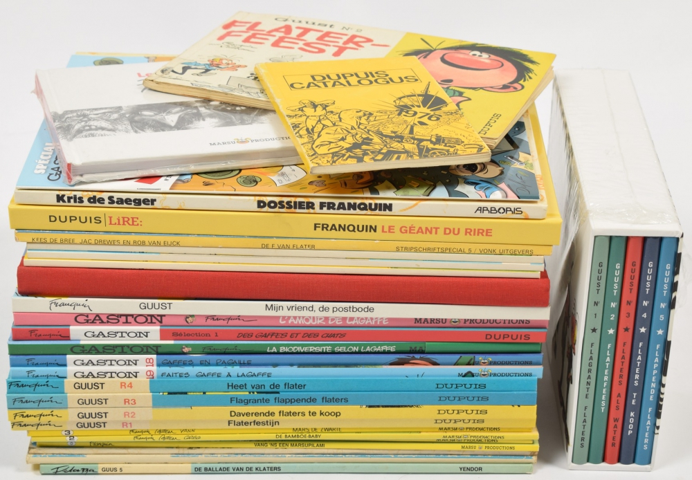 Guust no. 2, Flaterfeest, Dupuis, 1963. Oblong, 64 p. Read copy. Spine foot rest. + facsimile box with the first 5 oblong vols. + Guust R1-R4 Dupuis hc editions + the UHU lijmen mini book + Mijn vriend, de postbode, Dupuis, 1992 with pasted postage stamp + Les monstres de Franquin. Marsu productions, 2002. Still sealed + Franquin Le géant du rire. Hc, Lire (Dupuis), 2015 + Ton en Tinneke. Boordevol Grappen, Lombard, 1973. As new + 60 avonturen van Ton en Tinneke, Lombard, 1973, very fine + Ton de Pechvogel, Lombard, 1973, as new + 60 aventures de Modeste et Pompom. Collection du Lombard. Bound in halfcloth, 2006 - and 16 more.