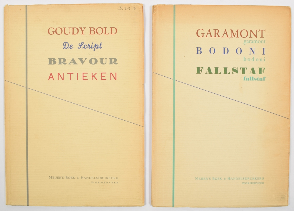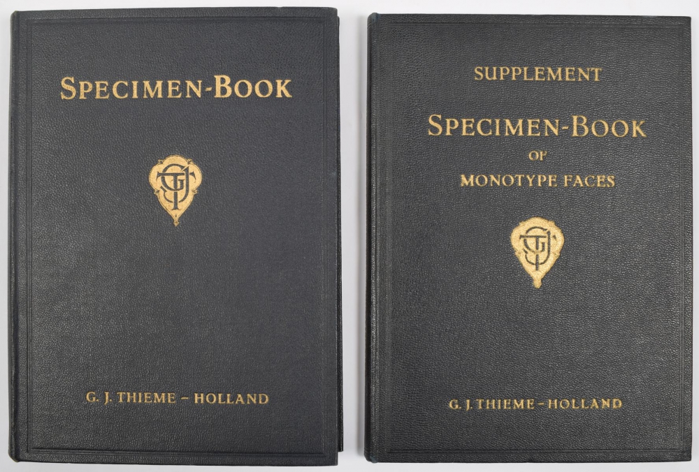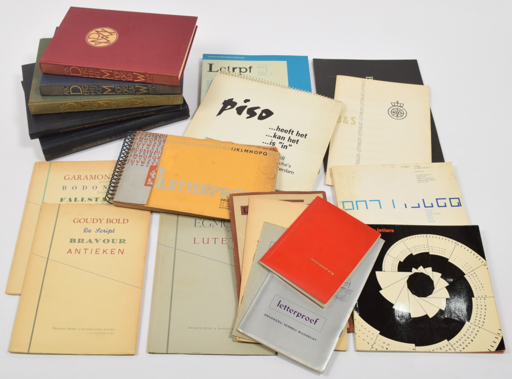 Incl.: (1) Letterproef Meijer's Boek- en Handelsdrukkerij. Wormerveer, 1932-1933, 2 vols., (4),153,(3); 187 p., the first with "Voorbeelden van boekillustratie", original uniform blue and red cloth with gilt binding decoration by S.H. de Roos, 4to; (2) Monotype- en handletter voor boekwerken/ Smoutletter en supplement boekletter. Onze letters. Handzetterij. Wormerveer, Meijer's Boek- en Handelsdrukkerij, 1940, (6),196 p., original gilt uniform with the previous work, sl. larger 4to; (3) Letterproef N.V. Drukkerij Sigfried. Amsterdam, 1940, unpaginated, with thumb index, original spiralbound wrapper, thin oblong, 15.5 x 26 cm. Wrapper with defects. Finely designed type specimen, thumb index in top margin with on the tabs the title Letterproef N.V. Drukkerij S [igfried in full on the last sub-specimen]; (4) Specimen-book of monotype and hand faces. Nijmegen, G.J. Thieme, 1927, 2 vols. (incl. supplement), VIII,304; 98 p., bound by L. Brandt en Zoon (Amsterdam) in original uniform gilt-lettered cloth, 4to. And with another 14 mostly smaller and later type specimens incl. another 3 by Meijer's Boek- & Handelsdrukkerij. (total ± 20)