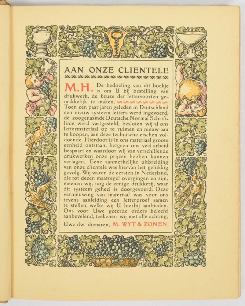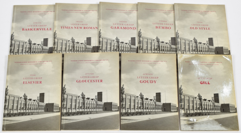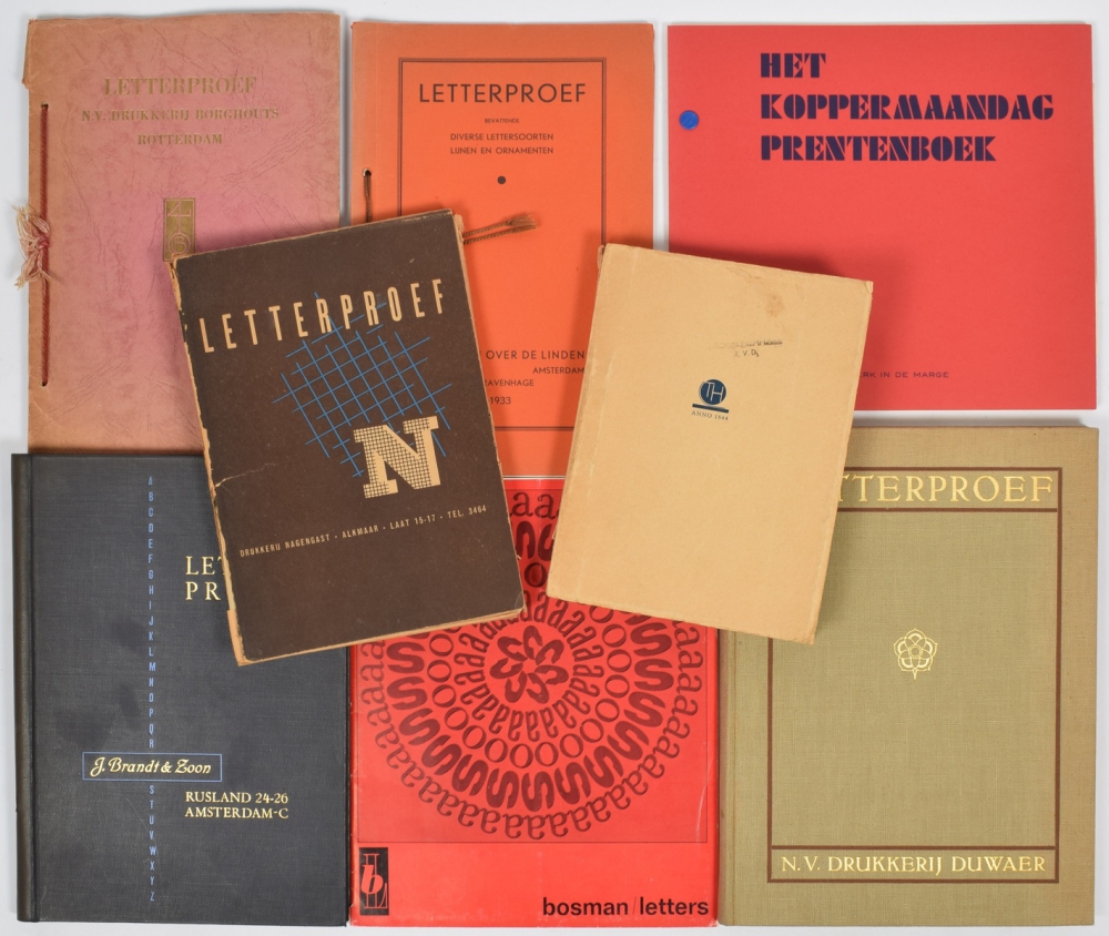 Incl.: (1) Letterproef uitgegeven door de drukkerij M. Wyt & Zonen Rotterdam (...) in het jaar 1910. Several parts in one vol., ills. and decorative margins, original cordbound halfcloth; (2) Letterproef van de lettersoorten, ornamenten, lijnen, randen, vignetten, enz. Amsterdam, N.V. Boek-, Kunst- en Handelsdrukkerij J.F. Duwaer & Zonen, (1911), 132, XIV p., original gilt-lettered cloth, 4to (deletions and annotations in pencil); (3) Letterproef N.V. Drukkerij Borghouts Rotterdam. (4),69 p., original cordbound wrapper (spine discoloured and with small tear); (4) Letterproef. Ten Hagen n.v. Drukkerij en Uitgeverij. The Hague, n.d. (c. 1935), 86 p., original clipbound wrapper. Spine defect. No copies in PiCarta. And with 16 similar works, incl. by Drukkerij Nagengast (Alkmaar), Drukkerij Over de Linden (Amsterdam) and Nederlandse Boekdruk Inrichting N.V. (Den Bosch, series of 9 works). (total 30)
