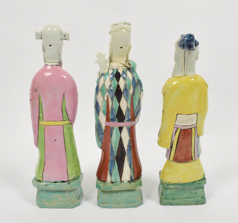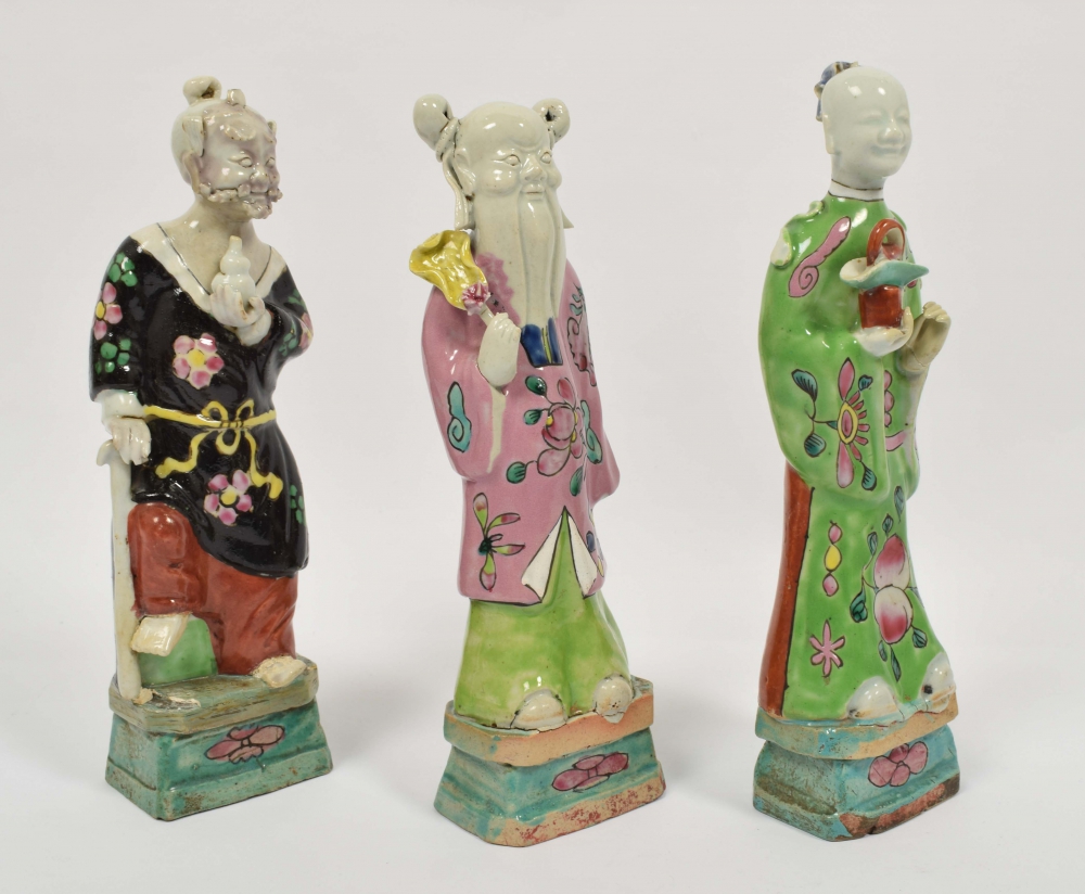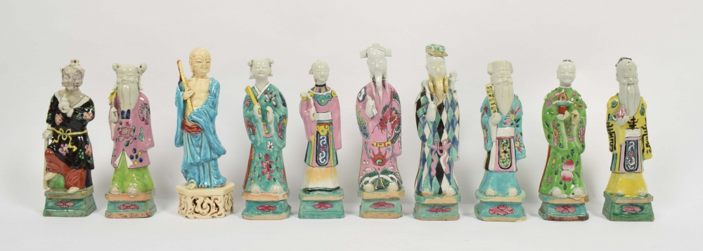 Lot with 9 porcelain sculptures. Sanshin with his 8 immortals: He Xiangu, Cao Guojiu, Li Tieguai, Lan Caihe, Lü Dongbin, Han Xiangzi, Zhang Guolao, Zhongli Quan. Height each ± 23 cm. With another porcelain sculpture, Republic of China era.