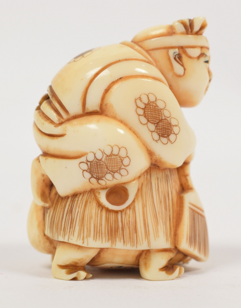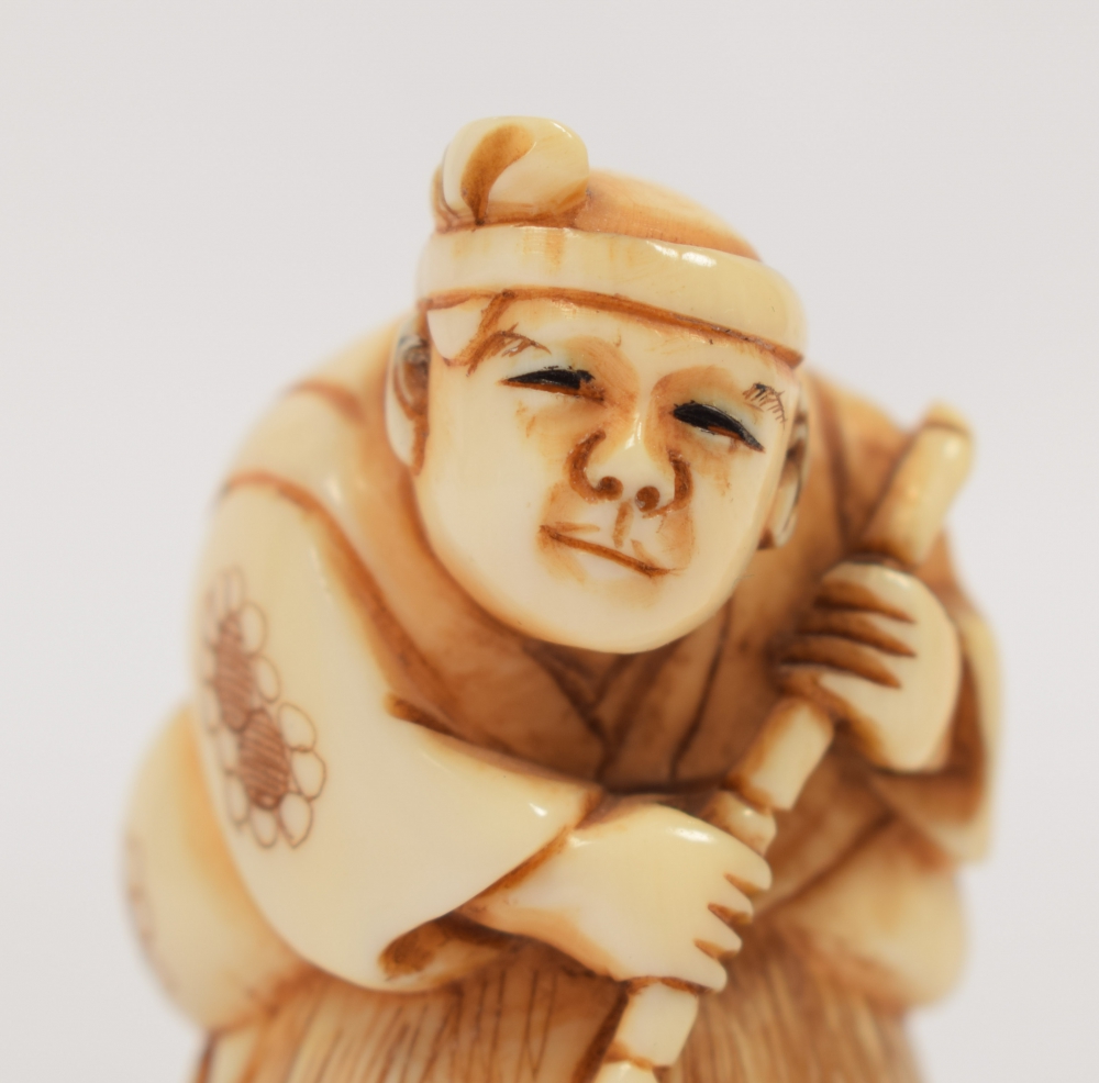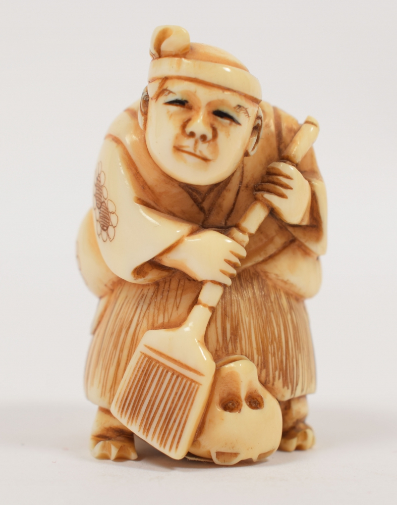Ivory, in the shape of a man sitting on a fantasy animal with broom. Bottom signed Set Guryo. Circa 1880. Height 4 cm.