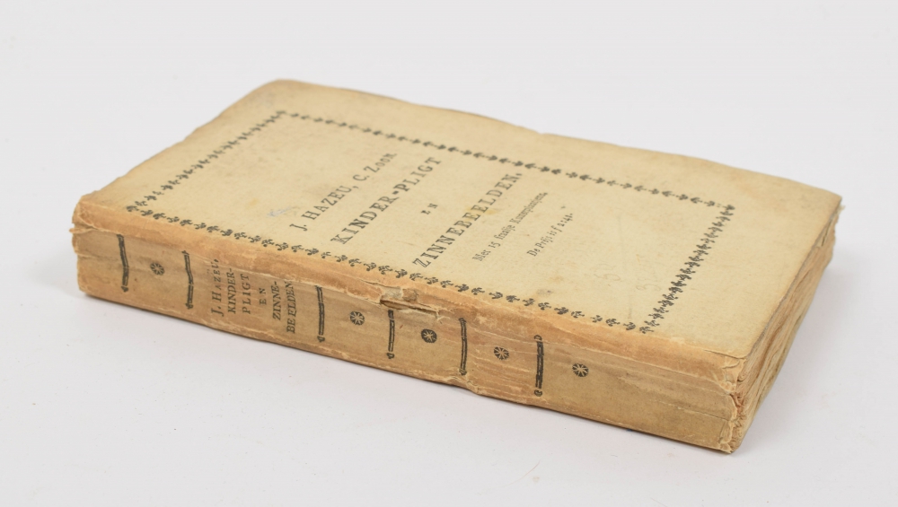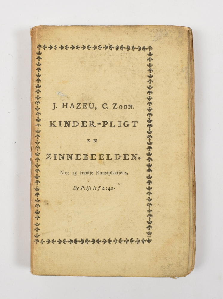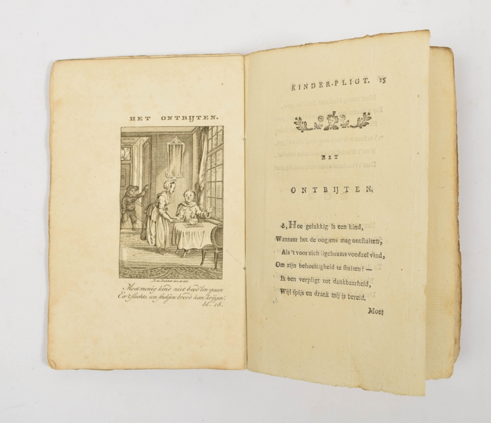 Spine sl. tanned and with minor damage, yet still an attractive, untrimmed copy, very rare in the original publisher's binding. The first edition of this very popular emblem book for children appeared in 1789 as did the first part of our printing. Additionally included on p. 178 a list (2 p.) of the subjects, incl.: "het ontwaaken", "het wasschen", "het ontbijten", "het aankleden", "het schoolgaan", "het avond eeten", "het naar bed gaan", "de nijd", "de gierigheid", "de waarheid" and "de liefde".