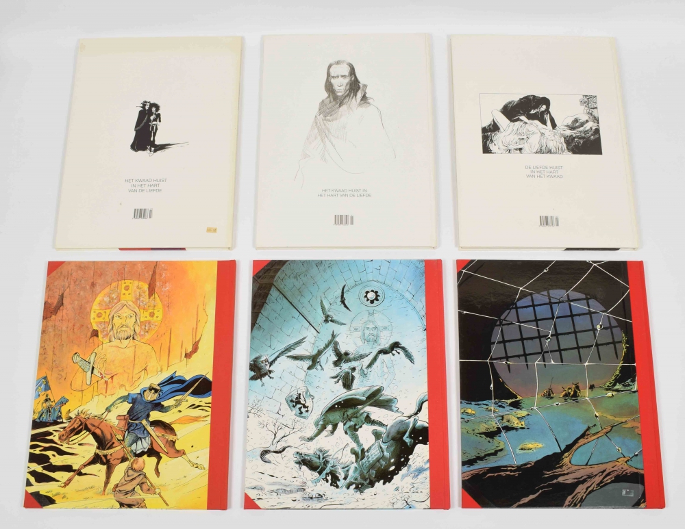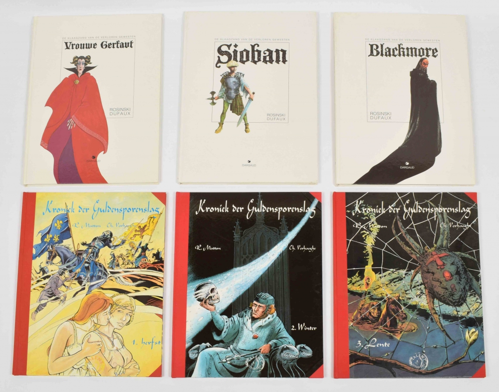 De Klaagzang van de Verloren Gewesten. Rosinski & Dufaux, Folio deluxe edition, Dargaud, 1993-1998. Sioban, no. 339/430 + Blackmore, no. 355/430, signed with bookplate and supplements + Vrouwe Gerfaut, no. 4/380. Signed with supplement. And Kroniek der Guldenspoorenslag. R. Matton/ Ch. Verhaeghe, Talent, 1994. Lente, Herfst & Winter. All folio in halfcloth, numbered and signed.