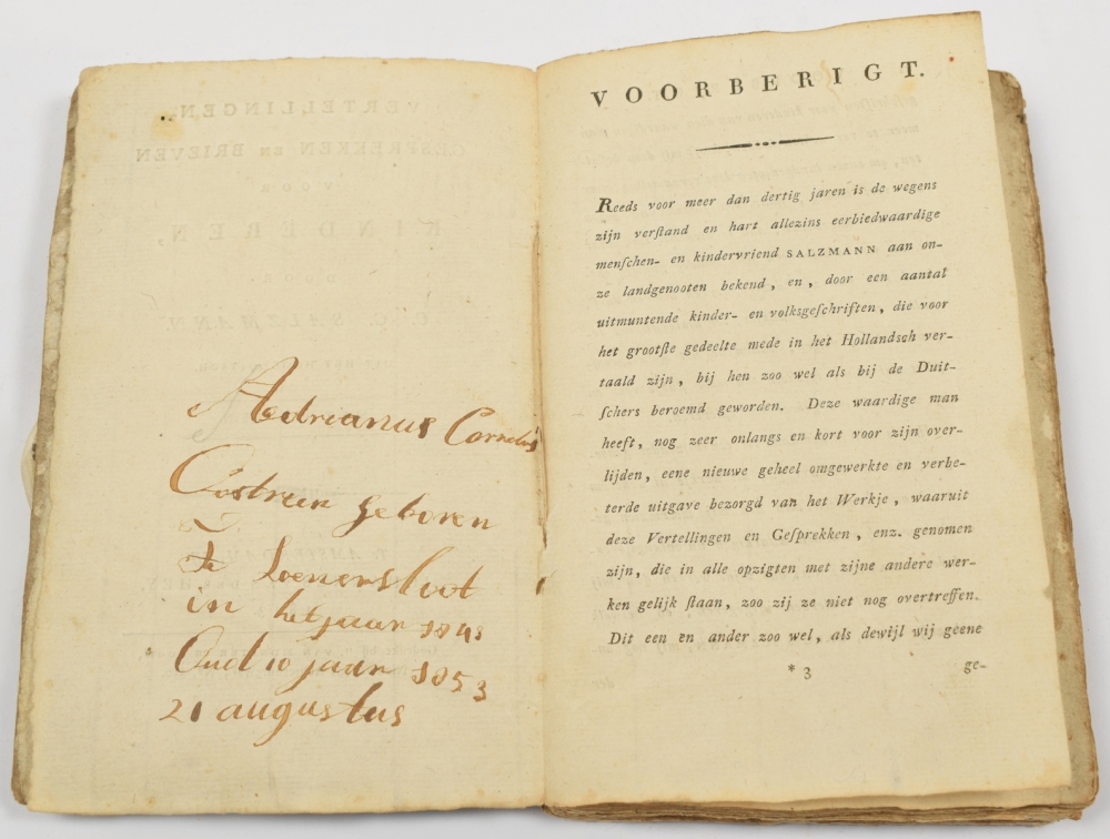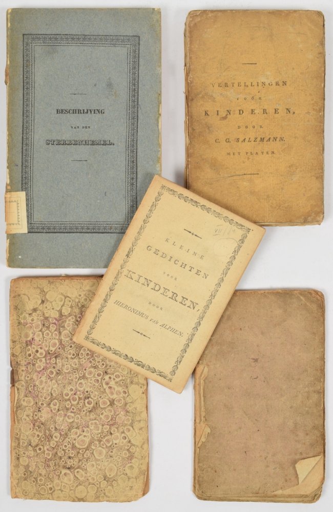 Hieronimus van Alphen. Amsterdam, Wortman, [c. 1820]. Small 8vo, sewn, title on wrapper, title page with small vignette, very good copy. Added: Vertellingen voor kinderen door C.G. Salzmann. Met platen. Amsterdam, Johannes van der Hey, 1813. Small 8vo, title on wrapper, title page with vignette, VII,(1),190 pp., pencil scribbling to endpapers, 3 handcoloured engravings (with pencil scribbling outside the image) by J.E. Marcus, spine dam., name in ms. after the title page + Trap der Jeugd. Mij. tot Nut van 't Algemeen. D. du Mortier en Zoon, J. de Lange & J. Oomkens, Leiden/ Deventer/ Groningen, 1828 + De Bloemendaler Minnezangster. Amsterdam, G. van der Linden, [c. 1865] + Omgewerkt en vermeerdert door F. Kaiser. Amsterdam, C.G. Sulpke, 1830. Ex bibl. Sold w.a.f.