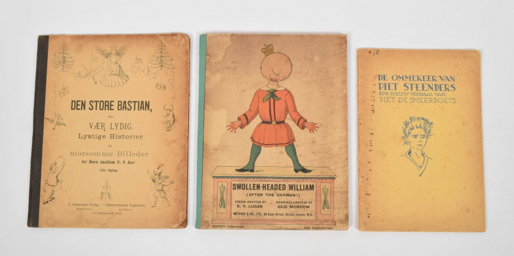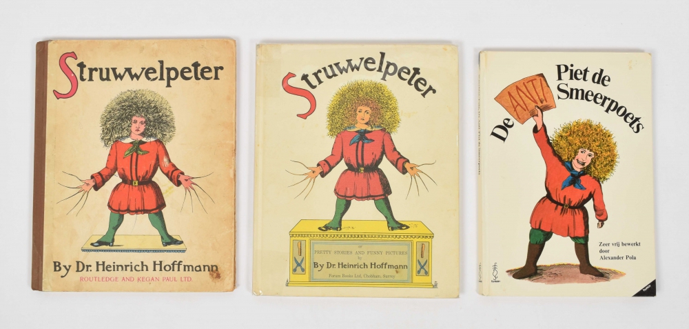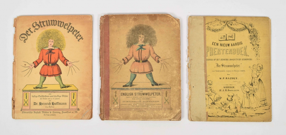 naar het beroemde Hoogduitsche kinderwerk "Der Struwwelpeter" [by H. Hoffmann], voor Nederlandsche jongens en meisjes bewerkt door W.P. Razoux. Schiedam, H.A.M. Roelants, 1849, 20 leaves printed on one side in colourlithography, original ills. cardboard. Spine dam. and coarsely pasted with paper + zesde duizend of the Jubileum edition 1898 + 1899 edition + Den Store Bastian, E. Jespersenns Forlag, Copenhagen, c. 1920 + Swollen-headed Wiliam. Sixtieth thousand, Methuen & Co, London, c. 1914. Stained, rebacked - and another 12 Struwwelpeter editions in varying quality.