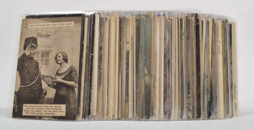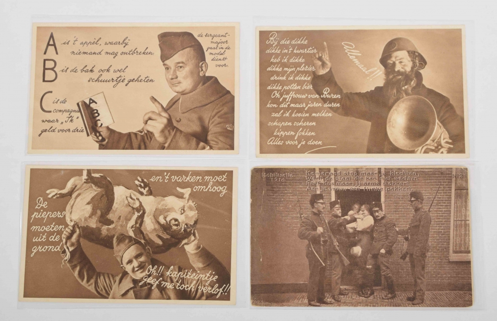 Lot with ± 100 postcards related to mobilisation in Dutch army camps, barracks, exercises etc. Artillerie inrichting b/d Hembrug Zaandam, Vliegkamp de Mok, Derde straat in het barakkenkampen geïnterneerden Harderwijk, Groeten uit Harskamp etc.