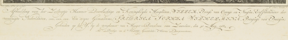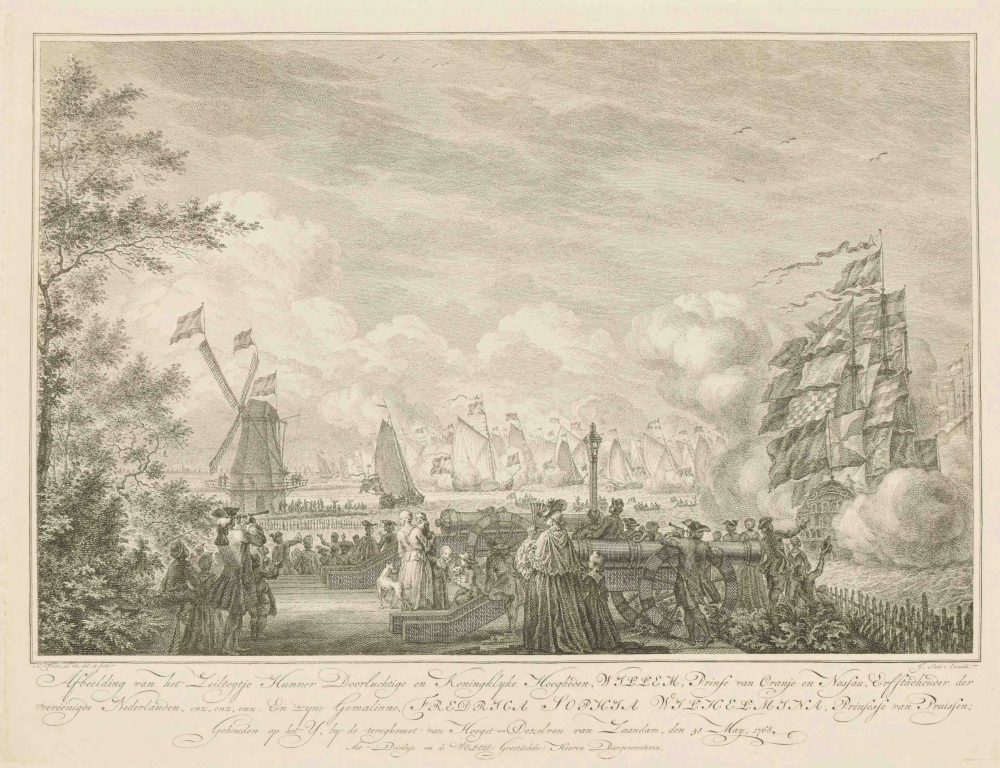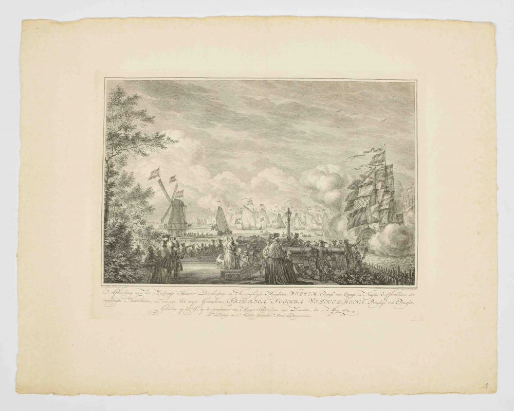 Afbeelding van het Zeiltogtje Hunner Doorluchtige en Koninklijke Hoogheden, Willem Prince van Oranje en Nassau (...) en Frederica Sophia Wilhelmina Prinsesse van Pruisen (...) gehouden op het IJ, (...) bij de terugkomst van Zaandam 31 May 1768. Issued by Johannes Smit between 1769 and 1773. Copper engraving with caption. Signed in the text below the print. Print incl. text 30 x 40 cm. Leaf 46 x 58 cm. Plano with mild middle fold.