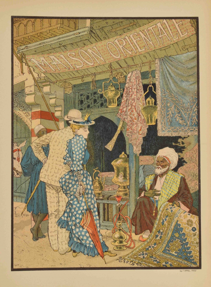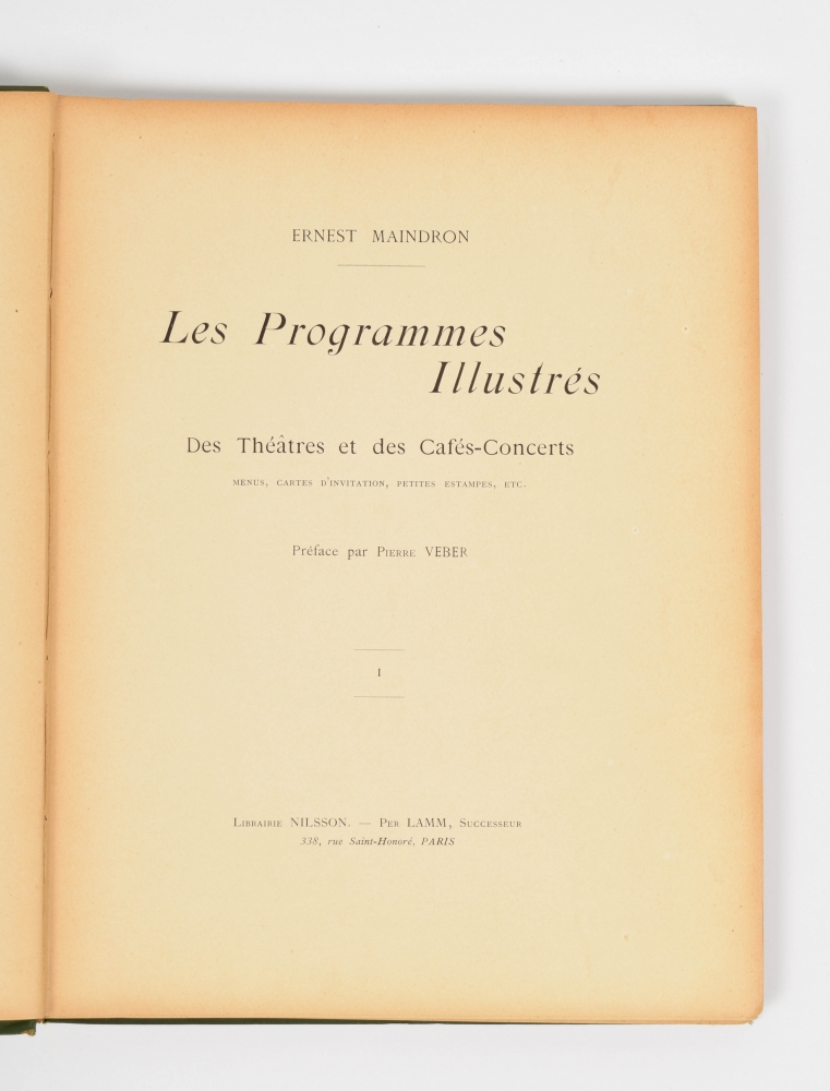 des Théatres et des Cafés-Concerts Menus Cartes d'Invitation, petites Estampes etc. par Ernest Muindron. Paris, Per Lamm ed., 1897. 40 text p. and 63 ills. Bound in green cloth with gilt illustration and title. Spine ends sl. rubbed. Else clean copy containing work by Ibels, Misti, Grasset, Rochegrosse, Chéret, Willette, Roubille, De Feure, Toulouse-Lautrec, Casal, Choubrac, Guillaume, Roedel and others.