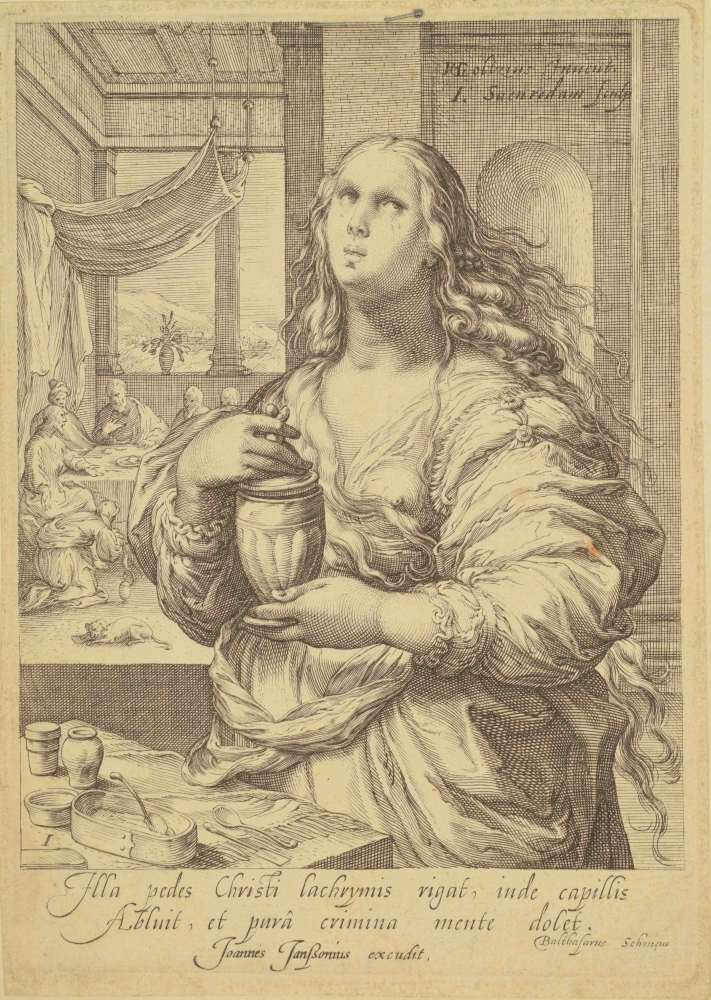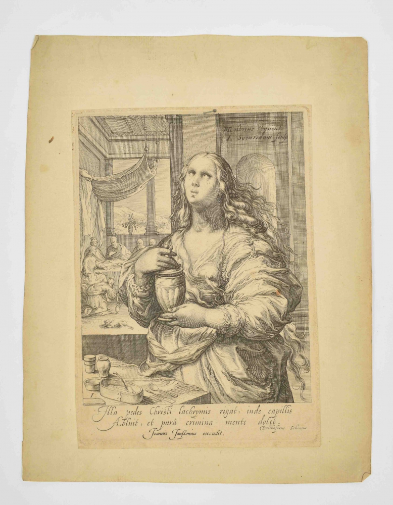 Hollstein Dutch, 35, third state (of six), with the address of Johannes Janssonius below the poem. Good impression on paper with watermark crowned fleur-de-lis and with good, narrow margins. Mary Magdalene, weeping, in her hand a jar with balm. In the background she anoints the feet of Christ during his visit to Simon the Pharisee.