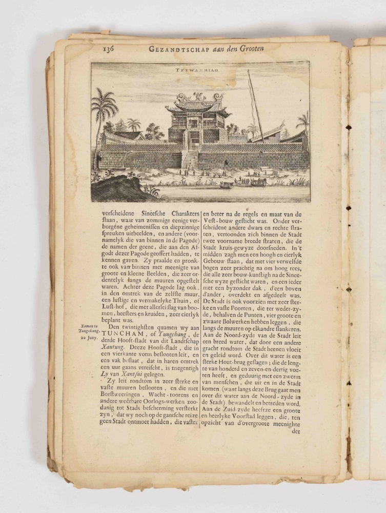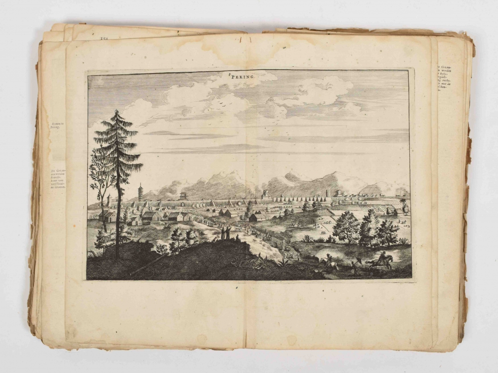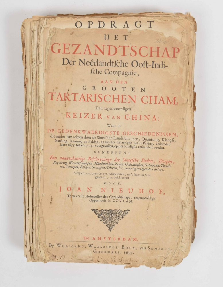 aan den grooten Tartarischen Cham, Den tegenwoordigen keizer van China (...) Beneffens Een naauwkeurige Beschryvinge der Sineesche Steden, Dorpen, Regeering, Weetenschappen, Handwerken, Zeden, Godsdiensten, Gebouwen, Drachten, Scheepen, Bergen, Gewassen, Dieren, &c. (...). Verçiert met over de 150 afbeeldtsels, na 't leven in Sina getekent, en beschreven door Joan Nieuhof. Amsterdam, Wolfgang etc., 1693, (4),208; 258,(8) p., 32 (of 34) double-page plates (mostly cityscapes) and 110 text ills. after drawings by the author, no binding and in loose quires/ leaves.