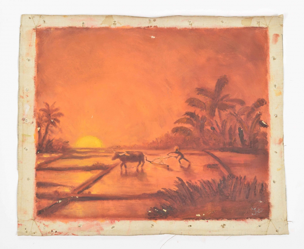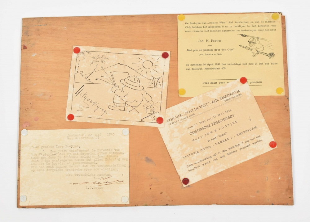 Johan Hendrik Pootjes was not only a prolific painter and drawing artist, but also vice president of the Nederlandsch Oost-Indische Escompto Maatschappij, one of the three largest banks in the Dutch East Indies. He was also an excellent athlete in various disciplines. This collection shows Pootjes as an artist skilled in (lively) townscapes, landscapes and other scenes. Pootjes exhibited for the Kunstkring Bandoeng in 1926 and at the Rijksmuseum in 1942. This collection includes a panel with still life, with on reverse mounted invitations for 2 other exhibitions of Johan Pootjes: "Oostersche reisschetsen", 11 May to 31 May 1940 at the Victoria-hotel in Amsterdam. With a typed card dated 22 May 1940, alerting Pootjes that the hotel is to be cleared "daar de Duitsche soldaten daar komen. Wilt U dus maatregelen nemen dat alles Zaterdag weg is. (...) Wie had ooit kunnen denken dat Uwe tentoonstelling op een dergelijke tragische wyze zou eindigen." (signed by L.D. Petit). Also a card for the exhibition "Met pen en penseel door Den Oost" (Java, Sumatra and Bali), April 1941, "eene causerie met kleurige aquarellen en tekeningen door den heer Joh. H. Pootjes." The works incl. the following captions: "Samarinda Oct. '26"; "Dansmeisje Den Passar Bali"; "Raksasa (tempelwachter) Bali"; "Straatje Medan"; "Poortje in Djokja"; "De Makakam Samarinda, oct. 26"; "Ragtime. Vrij naar C.J. Maks"; "Moeara Aman Pridjang Lebong 2/1 '26"; "Kampong Sindanglenko Garoet"; "Oud-Batavia"; "Strand te Benkoelen 30/12 '25"; "Malakadji Tjikono (Celebes) 4 dec. '25"; "Reeds 's morgens vroeg de hand aan de ploeg". (total ± 100)