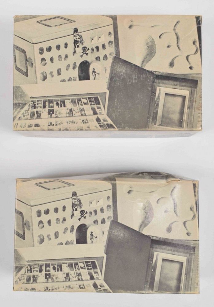 Catalogue in scroll format published on the occasion of the 1964 group exhibition Boxes at the Dwan Gallery in Los Angeles. Housed in a printed screen card box, the scroll measures 18.5 x 11.5 x 8 cm and consists of three parts glued together. It contains biographical text and images of sculptures that explore the significance of the box in twentieth century art.
